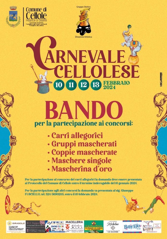 Il Comune di Cellole insieme all’ormai consolidato Gruppo Storico del Carnevale Cellolese, guidato da Filippo Farina, annunciano l’inizio dei preparativi per il Carnevale Cellolese 2024. Già sono aperte le iscrizioni per le 5 categorie: carri allegorici, gruppi mascherati, coppie mascherate, maschere singole e la mascherina d’oro.