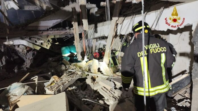 Coinvolto nell’esplosione un uomo, estratto in vita e affidato alle cure del personale sanitario sul posto.