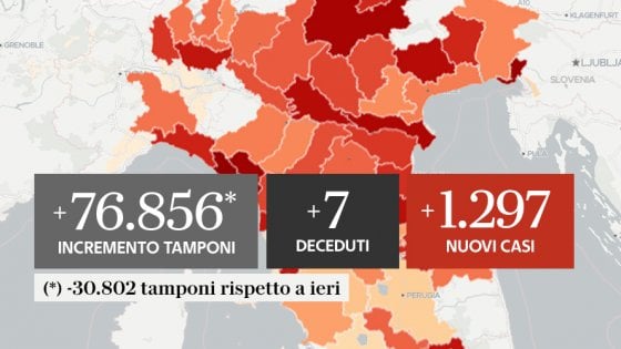 Nuovo calo oggi del numero di nuovi casi positivi di coronavirus in Italia: sono 1.297 contro i 1.695 di ieri, quindi meno 398. Il totale di casi dall’inizio dell’epidemia è ora di 277.634. Nelle ultime 24 ore si sono registrati 7 decessi (ieri erano stati 16).