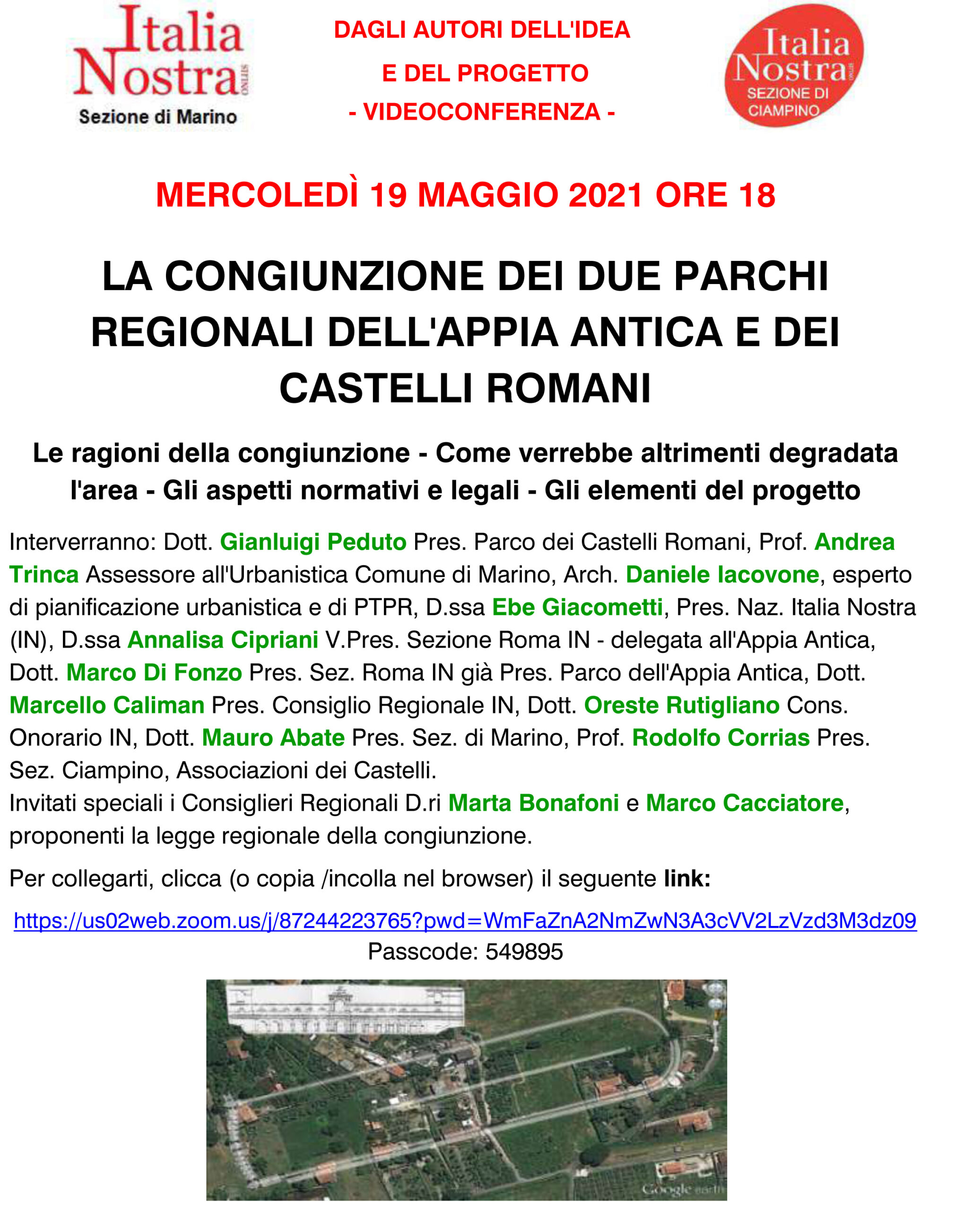 Interverranno: Dott. Gianluigi Peduto Presidente Parco dei Castelli Romani, Prof. Andrea Trinca Assessore all’Urbanistica Comune di Marino, Arch. Daniele Iacovone, esperto di pianificazione urbanistica e di PTPR, D.ssa Ebe Giacometti, Presidente Nazionale Italia Nostra IN, D.ssa Annalisa Cipriani V. Presidente Sezione Roma IN – delegata all’Appia Antica, Dott. Marco Di Fonzo Presidente Sezione Roma IN già Presidente Parco dell’Appia Antica, Dott. Marcello Caliman Presidente Consiglio Regionale Lazio IN, Dott. Oreste Rutigliano Cons. Onorario IN, Dott. Mauro Abate Presidente Sezione di Marino, Prof. Rodolfo Corrias Presidente Sezione Ciampino..
