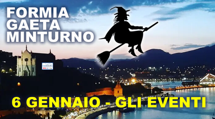 Formia, Festa della befana, 6 Gennaio, nel borgo di Castellone: h 9.00: Apertura della Manifestazione. Giro per le vie del Quartiere del Complesso Bandistico “Ritmo e Armonia” Città di Riardo diretto dal M° Nico Tartaglia. h 9.30-12.30: In Piazza S. Erasmo Sorprese, Musica e tanto divertimento La Befana e i suoi Dolci. Animazione, Giochi e Gonfiabili Minnie, Topolino e Frozen Truccabimbi e Laboratori Creativi. h 12.30: Estrazione sottoscrizione a premi “Sciuscio Formiano 2022”. Dolci Pensieri per tutti i bambini. Non mancheranno numerose sorprese!!!