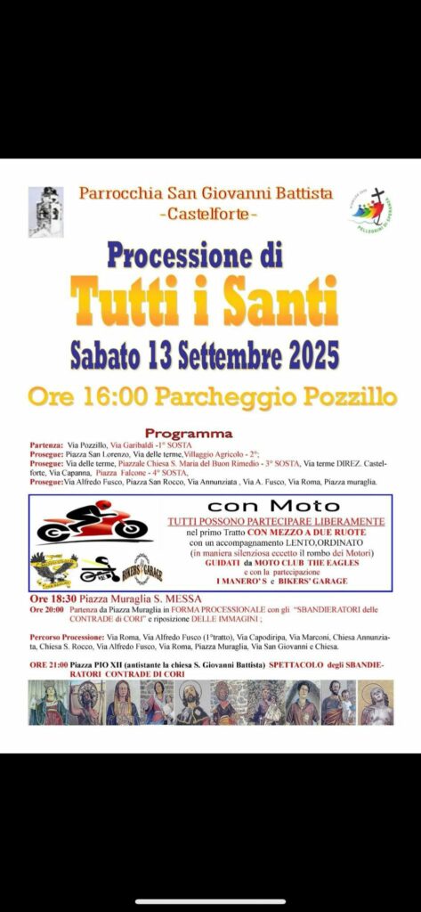 A Castelforte, la prima “Precessione su Ruote”: nove Santi, tra motori e innovazione – Un evento unico che unisce fede, tradizione e passione per le due ruote: sabato 13 settembre, alle ore 16:00, parte da Castelforte la seconda edizione della “Precessione su Ruote”, una straordinaria processione itinerante che vedrà nove Santi del Golfo di Gaeta sfilare a bordo di fiorini, scortati dai ruggiti delle moto del Moto Club The Eagles, insieme ai Manero’s e ai Bikers’ Garage.