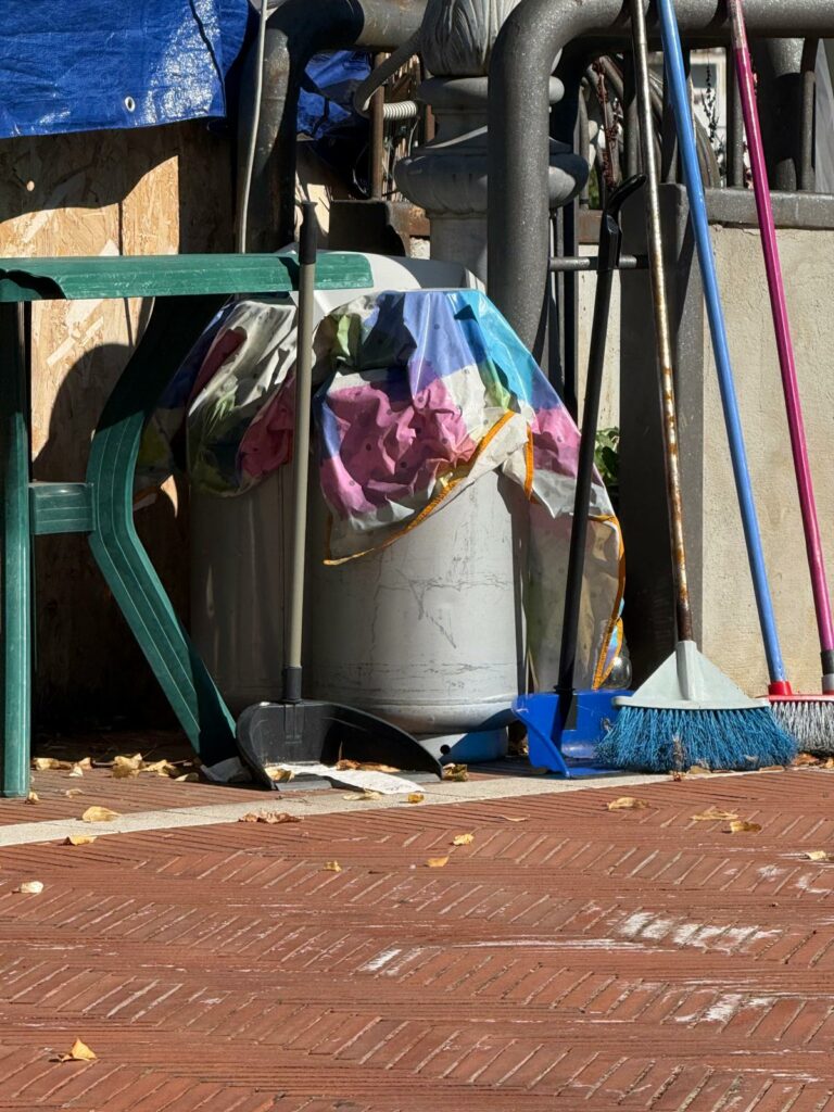 bottiglie accatastate, sedie in plastica poste sul piedistallo, bombole di gas, piante di peperoncino