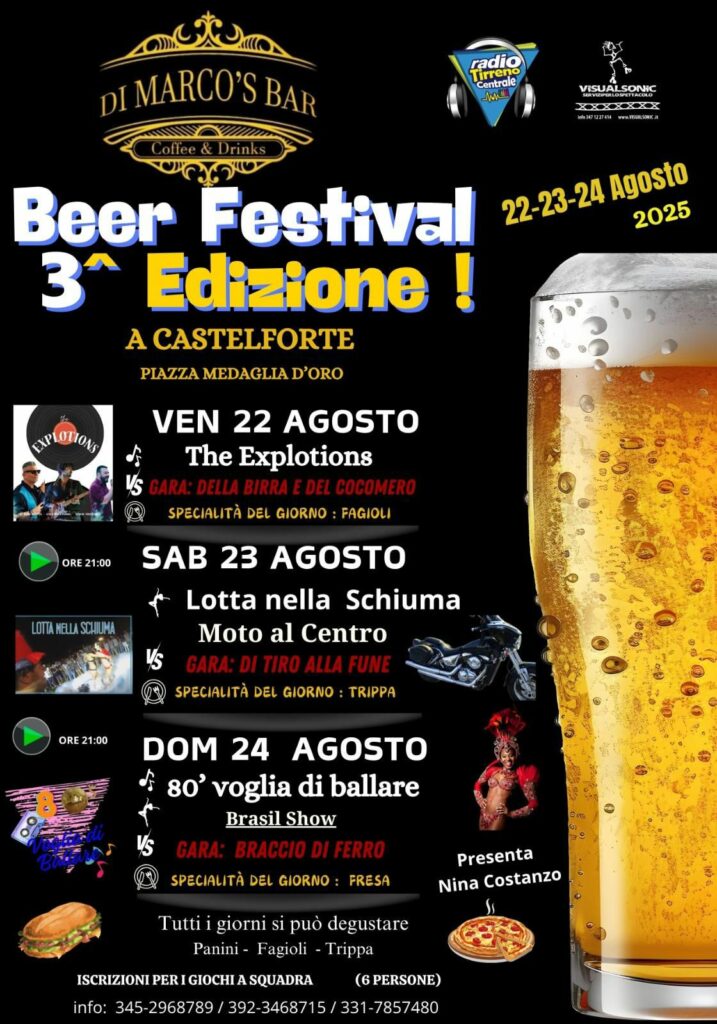 Castelforte si prepara a brindare: arriva la 3^ Edizione del BEER FESTIVAL. Cocomero, Brasil show, Musica e tanto altro – Castelforte si prepara a vivere uno degli eventi più attesi dell’estate: il Beer Festival, giunto alla sua terza edizione, torna a colorare le serate di fine agosto con un mix esplosivo di musica dal vivo, giochi di squadra, specialità gastronomiche e, naturalmente, tanta birra! L’appuntamento è per il 22, 23 e 24 agosto in Piazza Medaglia d’Oro, che si trasformerà in un grande spazio di festa all’aperto. Il festival sarà presentato da Nina Costanzo, con la collaborazione di Radio Tirreno Centrale e il supporto tecnico di VisualSonic Servizi per lo Spettacolo.