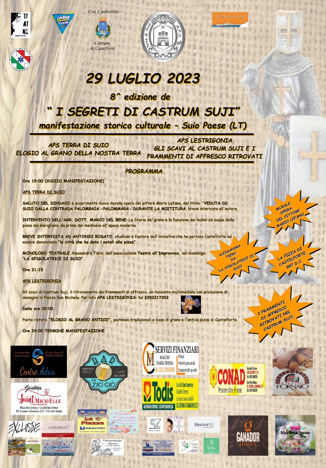 Castelforte, Suio: I SEGRETI DI CASTRUM SUJI – 29 luglio 2023: Sabato 29 luglio 2023 nel centro storico di Suio, si terrà l’ottava edizione della manifestazione storico culturale tradizionale dal titolo: I SEGRETI DI CASTRUM SUJI – (Elogio al grano antico di Suio).