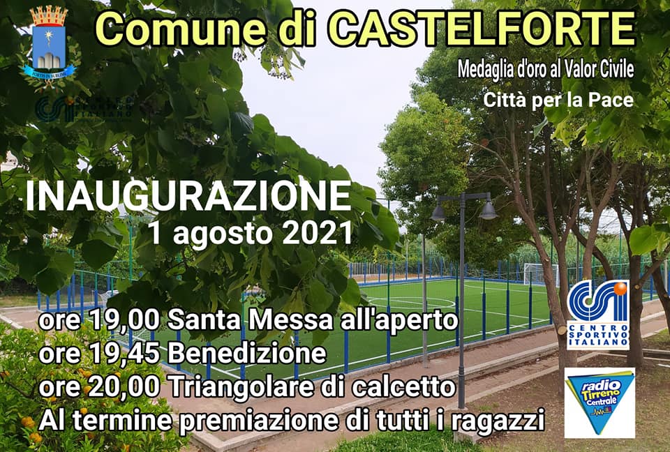 Il Sindaco invita, quindi, tutti gli abitanti a partecipare alla cerimonia di inaugurazione e, soprattutto, si rivolge ai ragazzi che saranno i principali destinatari dello spazio pubblico polivalente che è stato opportunamente ristrutturato. A conclusione della cerimonia e prima dell’inizio del triangolare di calcetto alla quale parteciperanno anche squadre del Centro Sportivo Italiano, che è la più antica ed importante associazione nazionale che raduna i giovani in Italia, si chiederà ai ragazzi di lasciare un segno nel murales arricchendolo ulteriormente e ciò al fine di farlo sentire sempre più come un bene collettivo di cui godere ma anche da curare.