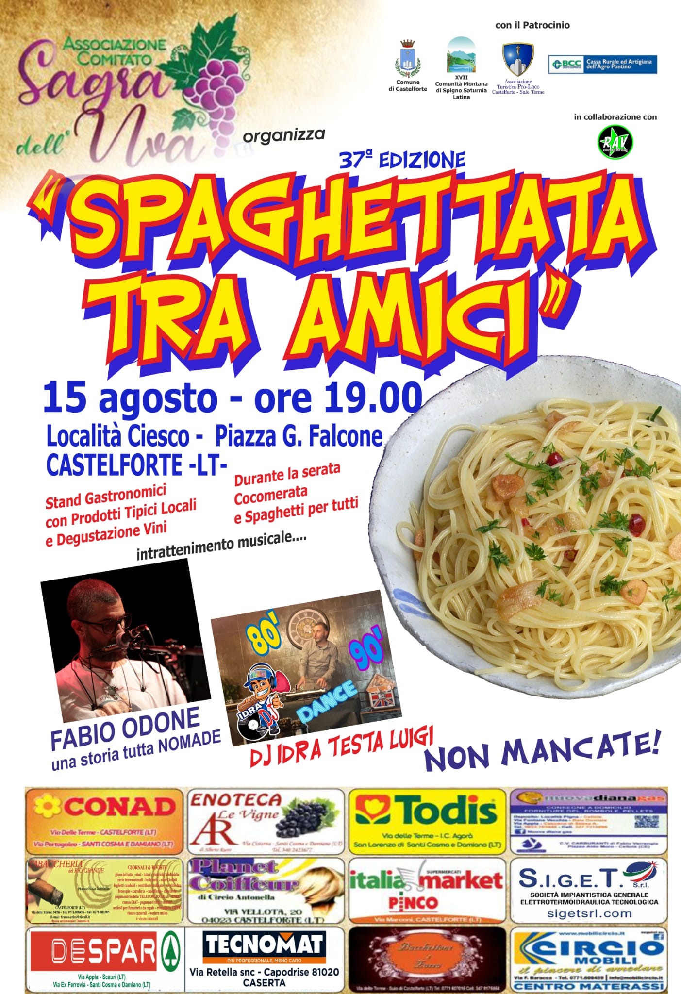 Il 15 agosto Spaghettata tra amici. ORE 19:00 – Il 15 agosto alle ore 19:00 a Castelforte in loc. Ciesco, Piazza G.Falcone l’associazione Sagra dell’uva vi invita alla Spaghettata tra amici. Stand gastronomici con prodotti tipici locali e degustazione vini, cocomerata e spaghetti per tutti con intrattenimento musicale di Fabio Odone e DJ Idra Testa Luigi. Di seguito la locandina dell’evento: