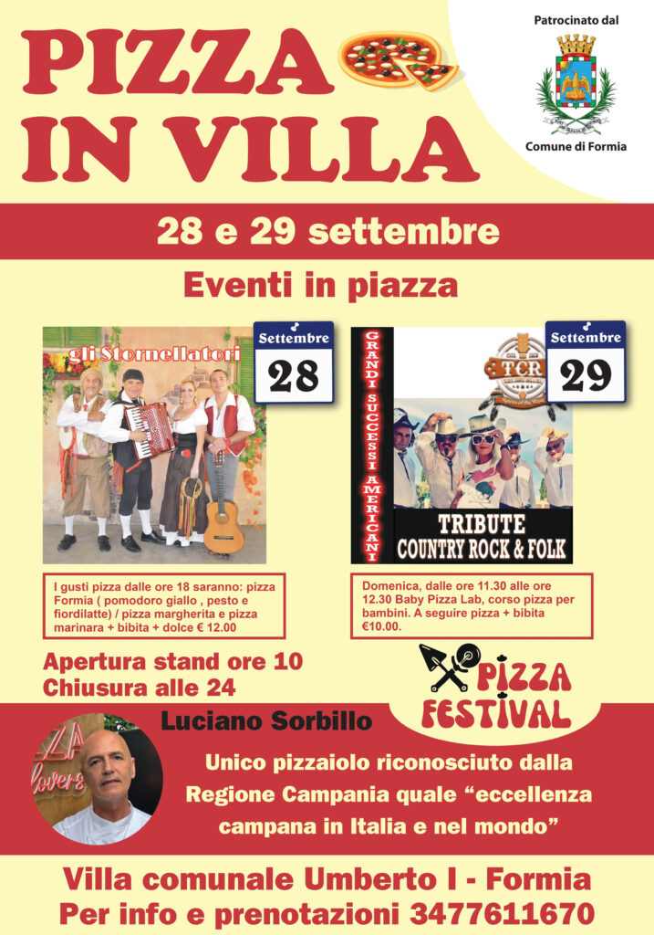 A Formia Pizza Festival in villa con Luciano Sorbillo. Le date dell’evento – Luciano Sorbillo, unico pizzaiolo riconosciuto dalla Regione Campania “quale eccellenza campana in Italia e nel mondo” presiederà l’evento Pizza Festival in Villa comunale Umberto Primo. Stand aperti dalle ore 10:00 alle ore 24:00. Il 28 settembre la serata sarà allietata dagli Stornellatori, mentre il 29 settembre Tribute Country Rock & Folk. Info e prenotazioni: 3477611670. Di seguito la locandina dell’evento: