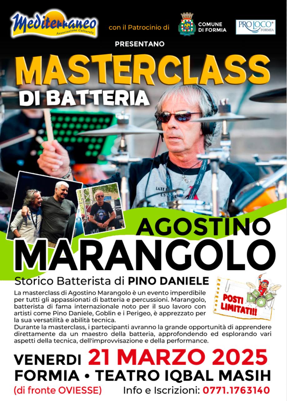 Agostino Marangolo, storico batterista di Pino Daniele, a Formia. La data – Lo storico batterista nei primi e migliori album di Pino Daniele sarà a Formia venerdì 21 marzo ore 16.oo. A seguire un suo excursus di circa 50 anni di esperienza da raccontare vissuta con i migliori musicisti. Di seguito la locandina dell’evento: