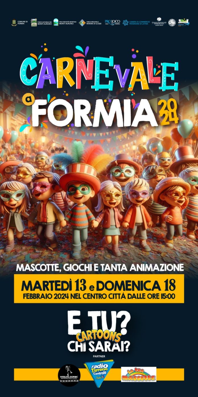 Pro Loco Città di Formia Carnevale – Tutto pronto per festeggiare il Carnevale nella Città di Formia. La Pro Loco è attiva e organizzata per far trascorrere sin dal primo pomeriggio, dalle ore 15:00, un gioioso pomeriggio per i bambini, i ragazzi e gli adulti. E’ sempre un gradito spettacolo vedere i cittadini in pieno divertimento, trascorrendo ore di spensieratezza, insieme, tra le tante iniziative che si susseguiranno. L’ appuntamento del 13 febbraio, martedì grasso, si avvia dalle ore 14:30 con il raduno in Piazza Mattej, alle 15:00 parte la gran sfilata di cartoons a cura di palestre, associazioni sportive, associazioni culturali, enti parrocchiali e gruppi in maschera a cui si unirà la Amaseno Harmony show band.