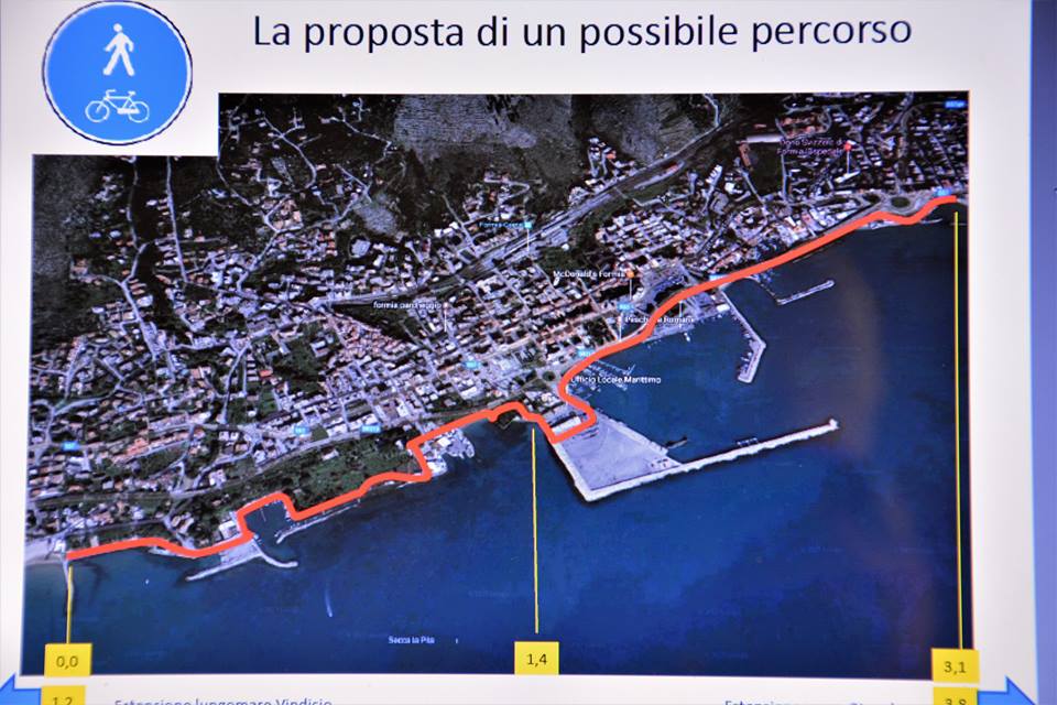 Si trattava di una pista ciclopedonale da svilupparsi su proprietà pubbliche e su aree demaniali. Partendo da ovest il percorso ipotizzato lambisce la pinetina di Vindicio e il porticciolo di Caposele. In corrispondenza di quest’ultimo è previsto l’allargamento e la continuazione (su passerelle in legno sostenute da pali infissi in acqua) dell’attuale “malo passo” che costeggia la garitta borbonica, fino all’area demaniale antistante quella che viene individuata come l’ex villa di Cicerone.