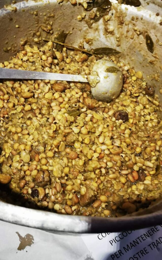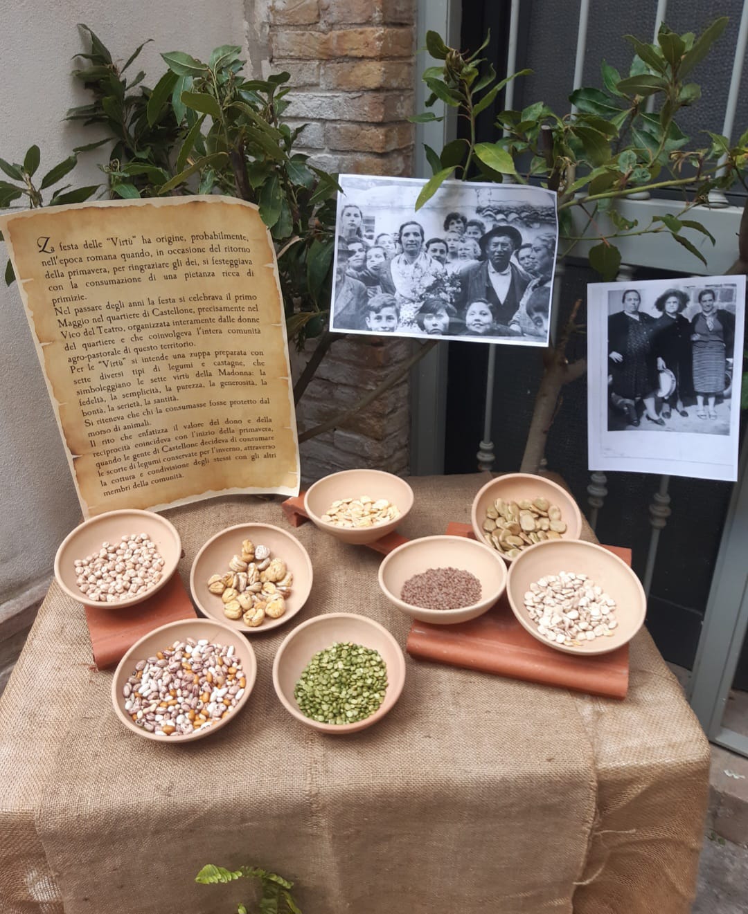 Tra le tradizioni più suggestive recuperate in occasione della Festa di Sant’Erasmo vi è quella delle “virtù”, un rito dalle origini antiche che affonda le sue radici nel mondo contadino, ma che nel tempo ha assunto un profondo significato religioso. Per l’occasione viene servito un piatto simbolico della tradizione, composto da sette legumi e castagne secche, in omaggio alle sette virtù della Madonna.