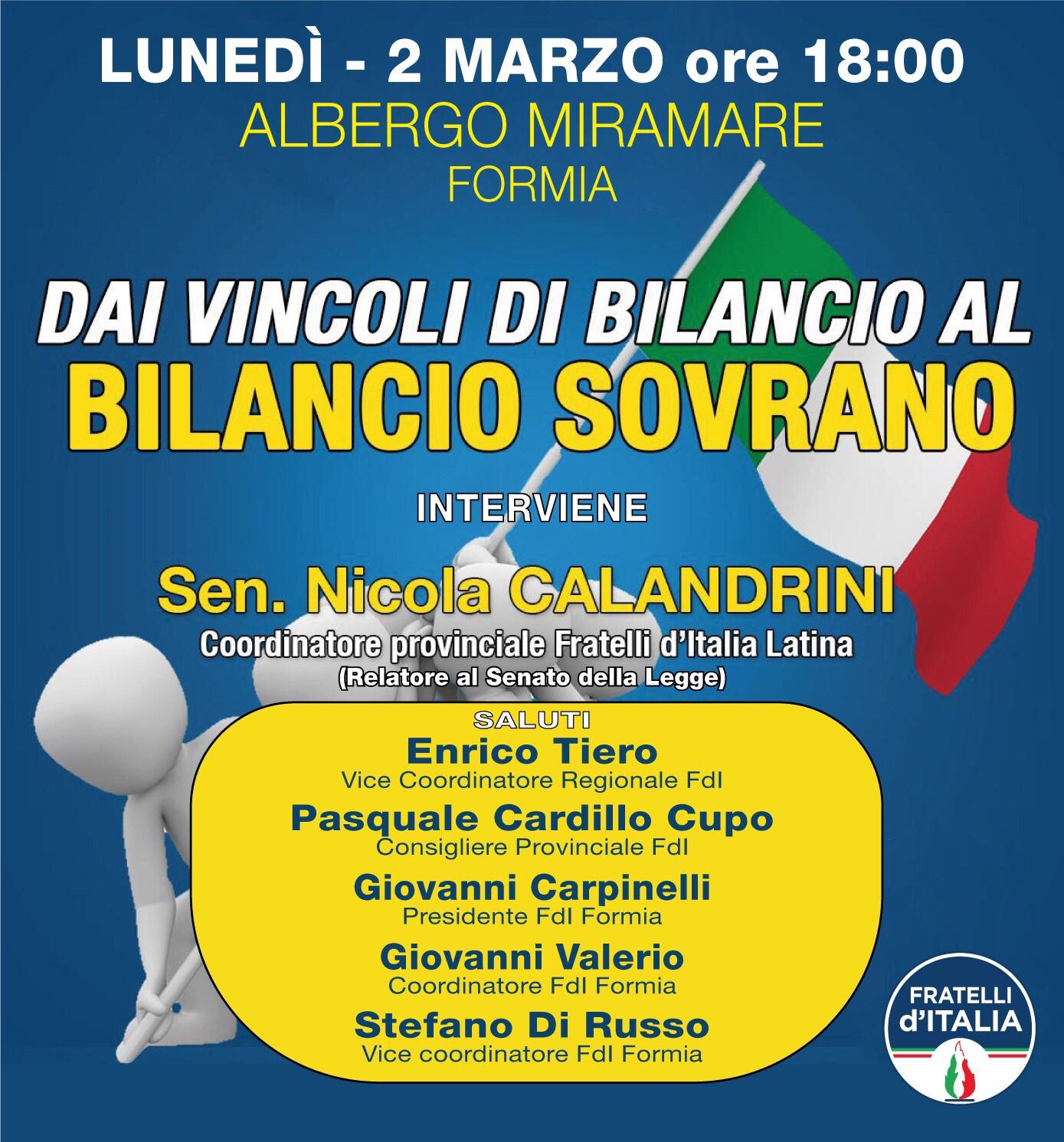 Lunedì 2 Marzo, presso il Grande Albergo Miramare Formia, ci sarà un convegno organizzato dal gruppo di Fratelli d’Italia di Formia, dove interverrà, il Senatore Nicola Calandrini coordinatore provinciale di Fratelli d’Italia e (Relatore al Senato della Legge) illustrerà il bilancio dello Stato e i suoi vincoli.