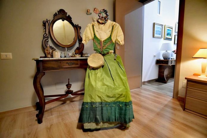 “Custodito da una concittadina, l’abito presenta tutti gli elementi egregiamente dipinti dal nostro illustre concittadino: Il corpetto, lo scialle , il sottanino – camiciotto, la gonna, un cordoncino intrecciato multicolore per i capelli, la coroncina – fermaglio , e il tamburello.