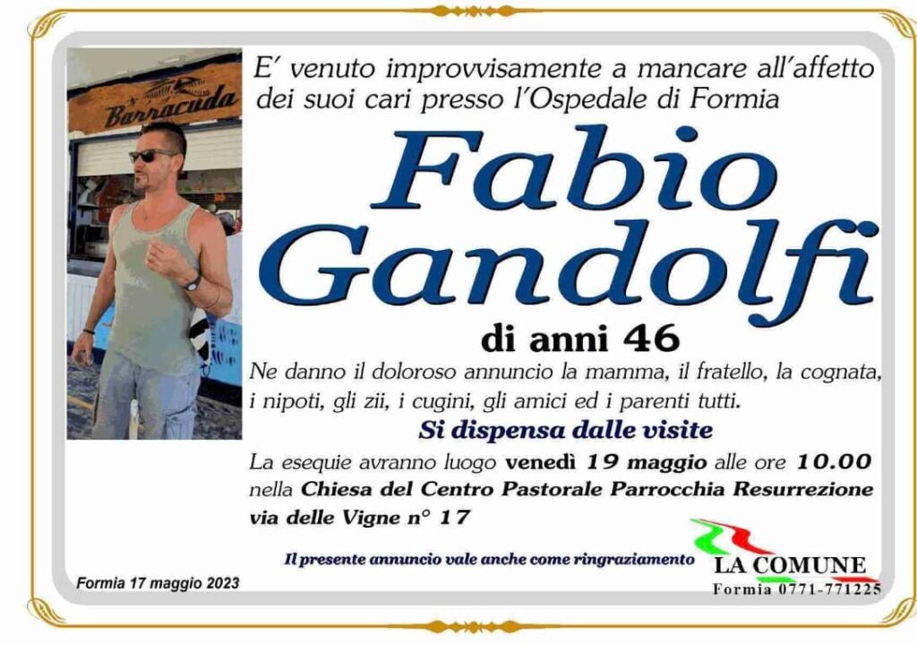 E’ venuto a mancare a causa di un malore Fabio Gandolfi, 46enne formiano molto conosciuto nella frazione di Gianola. Fabio Gandolfi era uno dei titolari dello stabilimento Barracuda. Le esequie avranno luogo domani venerdì 19 maggio alle ore 10:00 nella Chiesa del Centro Pastorale Parrocchia Resurrezione in Via delle Vigne, 17. La redazione di Tuttogolfo.it si stringe al dolore della famiglia.