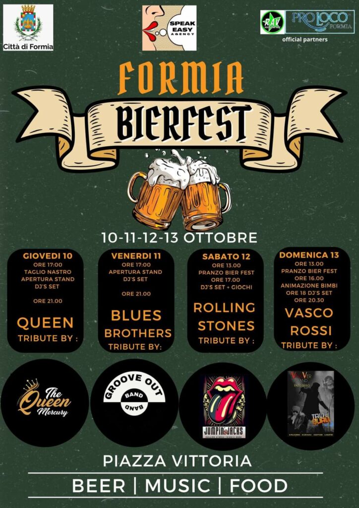 Festa della Birra a Formia, “Formia Bierfest”. Il Programma – Sale l’attesa per “Formia Bierfest”, la Festa della Birra, un evento ricco di divertimento e musica live, distribuito su quattro serate di puro intrattenimento. Saranno presenti stand gastronomici con una grande varietà di birre, con una selezione di cover band di gruppi che si esibiranno dal vivo ogni sera, offrendo generi musicali diversi per accontentare tutti i gusti. Quattro giornate, in programma da giovedì 10 a domenica 13 ottobre, nella centralissima Piazza della Vittoria, nel cuore della città di Formia, dove sarà possibile gustare una vasta selezione di birre artigianali italiane e internazionali, accompagnate da specialità locali e street food. Un ambiente festoso e conviviale dove non mancheranno momenti di intrattenimento extra, come giochi e animazione per i più piccoli ed altre iniziative.