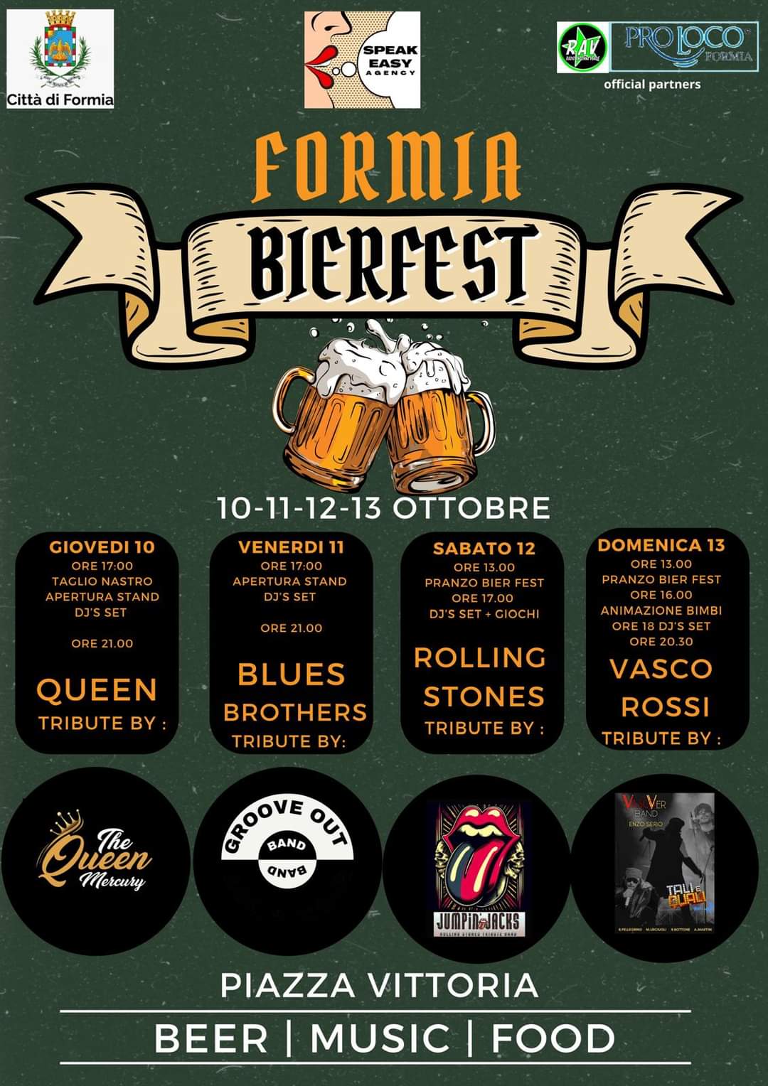 - Sabato 12 Ottobre: – ore 13.00 pranzo Bier Fest e dalle ore 17.00 dj’s set+giochi con il tributo ai Rolling Stones con i Jumpins Jacks;