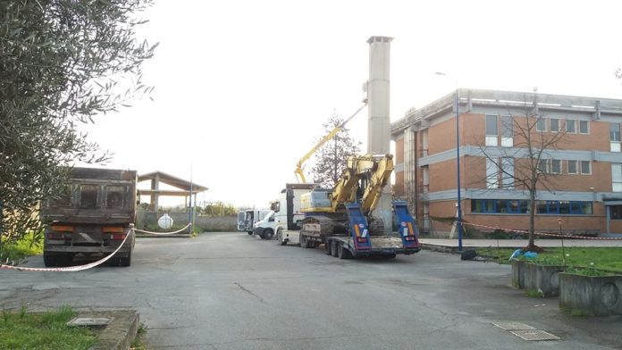 ABBATTUTA LA TORRE FUMARIA IN CEMENTO NELL’ISTITUTO ALBERGHIERO. La torre, non più utilizzata da anni era alta 15 metri e faceva parte di una centrale autonoma che serviva il fabbisogno energetico del Convitto annesso all’Istituto alberghiero.