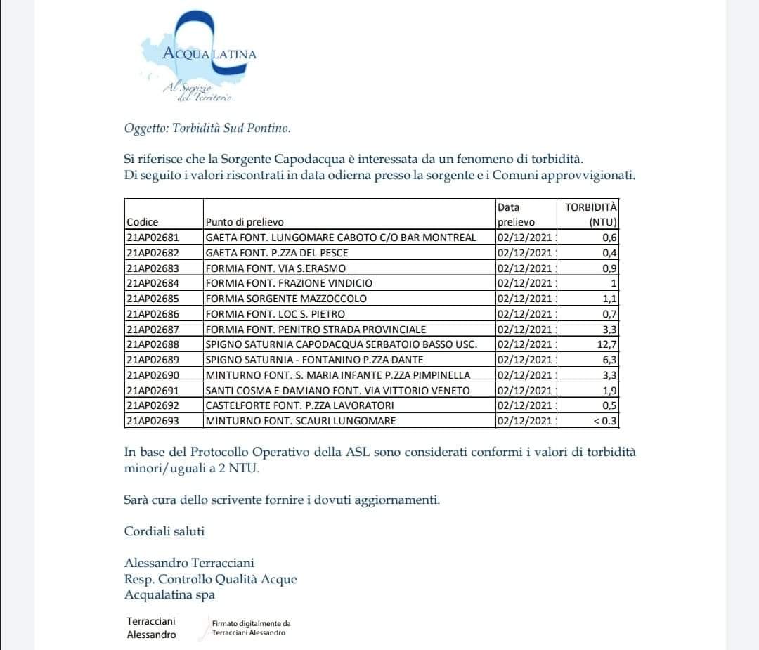 FORMIA, ACQUA – Paola Villa sul tema acqua pubblica comunica: “Questo il report (foto 1) dei valori di torbidità di Acqualatina, sui dati di questo report i Comuni di Spigno e Minturno hanno emesso ordinanza di NON POTABILITÀ dell’acqua. L’ordinanza si emette quando quel “numeretto” chiamato NTU supera 2. Stranezza di numeri…Il comune di Formia non ha emesso alcuna ordinanza eppure su “frazione Penitro” stiamo a 3,3!!! Stranezza di fatti…Le autobotti arrivano a Formia anche se non c’è ordinanza… Stranezze di fango…Stiamo al 64° giorno di non potabilità del 2021, questi 64 giorni di fango vanno stornati dalla bolletta!!! La richiesta è stata già fatta il 20 ottobre 2020, sindaco Gianluca Taddeo portiamola avanti, Acqualatina è inefficiente e inefficace!!!”. Incessante la battaglia di Paola Villa sul tema acqua pubblica.