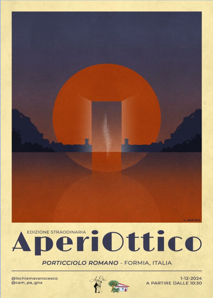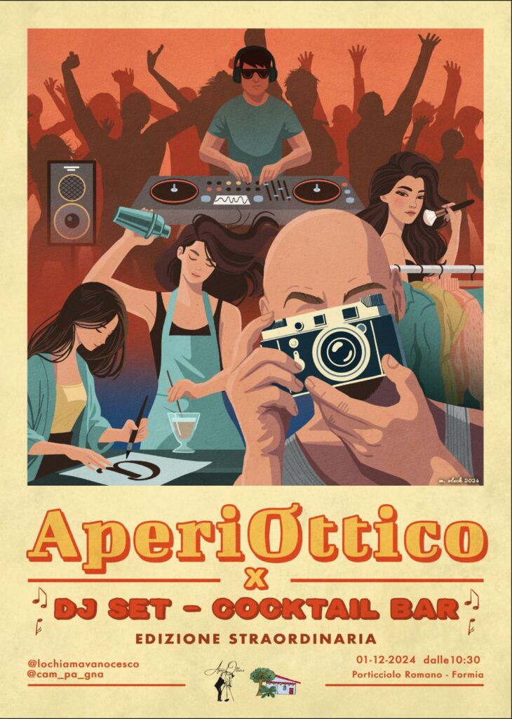 Formia, AperiOttico: Mashup di arte, fotografia, musica e convivialità – L’AperiOttico è un evento creativo che combina arte, fotografia, musica e convivialità, con l’obiettivo di creare un’occasione di incontro e condivisione. Offre ai partecipanti una varietà di esperienze artistiche: dalla fotografia (anche con dimostrazioni di sviluppo di pellicola in bianco e nero) alla pittura e al disegno, e un’atmosfera accogliente. il tutto è organizzato dai ragazzi stessi che partecipano con l’assistenza della associazione la magica ed il patrocinio del parco Riviera di Ulisse. L’evento si svolgerà il primo dicembre 2024 dalle ore 10:30 presso il Porticciolo Romano di Formia. Di seguito la locandina dell’evento. POTRANNO AGGREGARSI LIBERAMENTE ALTRI GIOVANI ARTISTI contattando il numero 3896078819