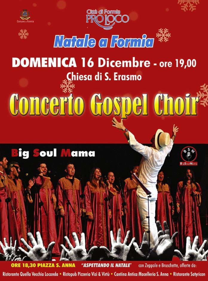 Questa volta la Pro Loco di Formia, sotto la neo presidenza del poliedrico Gianni Donati e con il patrocinio del Comune di Formia, offre ai cittadini ed ai numerosi turisti che, visiteranno la nostra città in questo periodo natalizio, il calore e la spiritualità tipici della musica gospel, riavvicinandoli ai valori tradizionali che il Natale porta con sé e che troppo spesso la vita di tutti i giorni ci fa tralasciare: amore, solidarietà, fratellanza, altruismo.