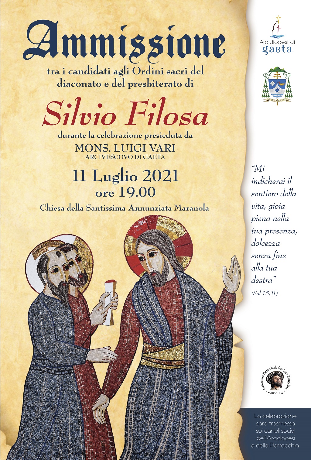 Domenica 11 luglio alle ore 19.00 nella chiesa dell’Annunziata a Maranola di Formia, si terrà l’Ammissione tra i candidati agli Ordini sacri del diaconato del presbiterato del seminarista Silvio Filosa.
