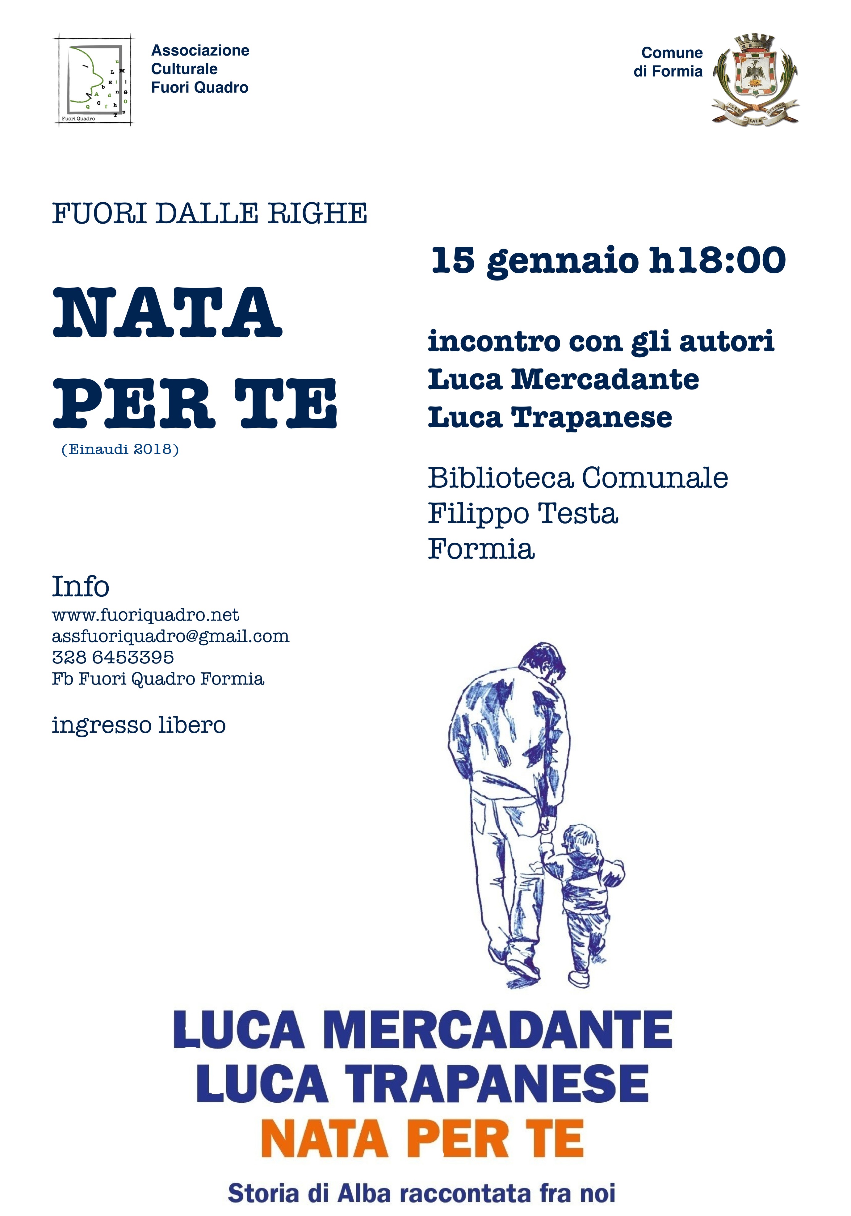 Il 15 gennaio alle ore 18:00 alla Biblioteca Filippo Testa di Formia la presentazione del libro “Nata per te” (Einaudi, 2018) con gli autori Luca Mercadante e Luca Trapanese promossa dall’associazione culturale Fuori Quadro con il patrocinio e la collaborazione dell’assessorato alla cultura del Comune di Formia.