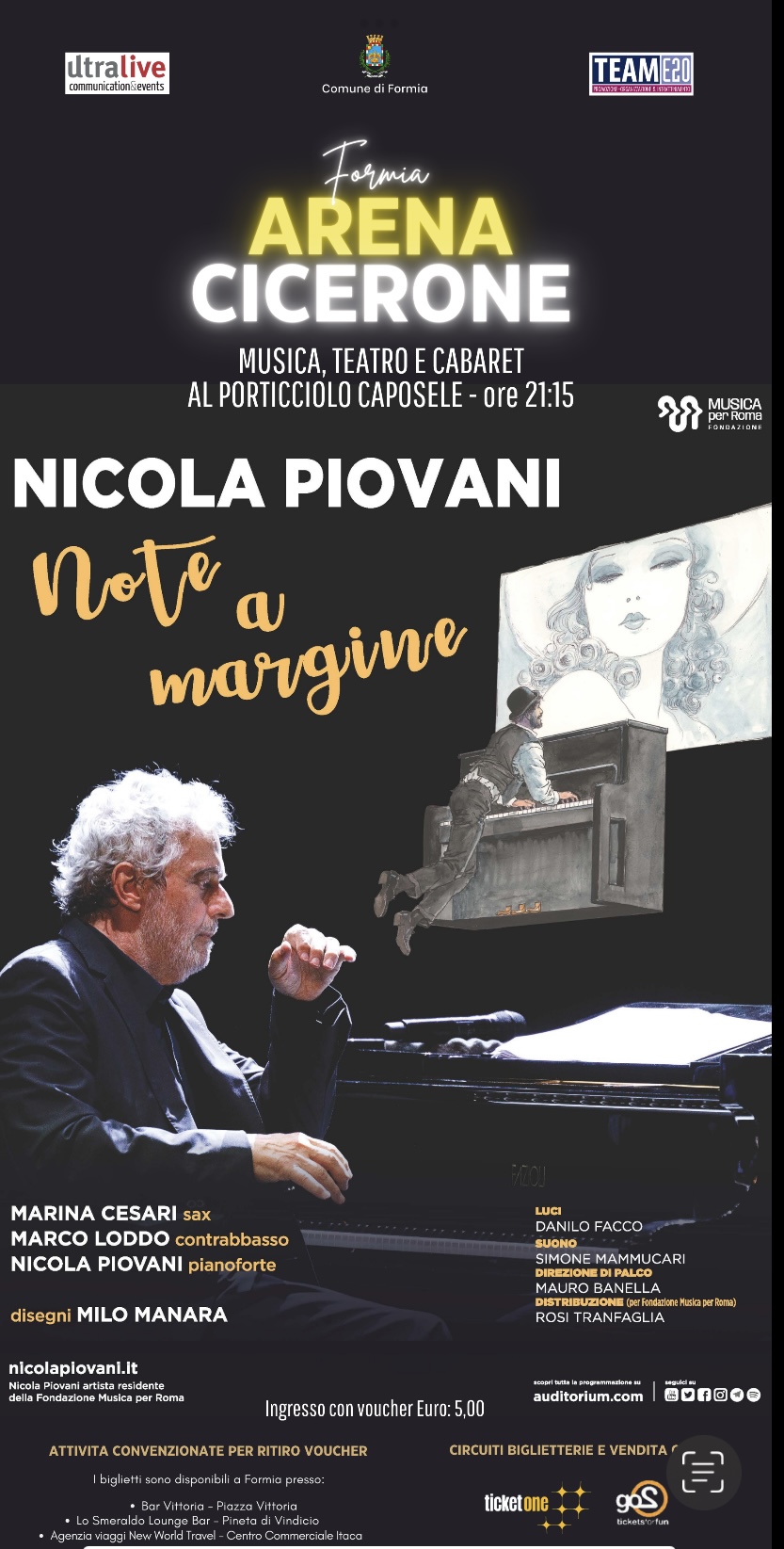 Il celebre pianista, compositore e direttore d’orchestra Nicola Piovani sarà protagonista del concerto di raffinata e altissima qualità artistica in programma lunedì 21 agosto alle ore 21.15 all’Arena Cicerone di Formia (1.300 posti a sedere), l’area del Piazzale Caposele, sul litorale di Vindicio, una finestra speciale a due passi dal mare. Il premio Oscar nel 1999 per le musiche del film “La vita è bella” diretto e interpretato da Roberto Benigni, si esibirà nello spettacolo “Note a margine”, una sorta di racconto autobiografico in cui il 77enne artista romano, nato nel quartiere Trionfale, condividerà con il pubblico esperienze, ricordi ed emozioni di oltre quaranta anni di carriera. L’evento, inserito nel ricco carnet di appuntamenti, è promosso dall’Amministrazione comunale guidata dal sindaco Gianluca Taddeo e dall’Assessorato
