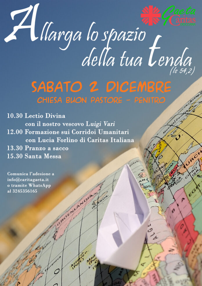 L’Equipe Diocesana, di cui è infaticabile direttore don Alfredo Micalusi, informa: 2 dicembre 2023 presso la Chiesa del Buon Pastore di Penitro sarà una giornata dedicata alla spiritualità con la presenza e la guida del nostro Arcivescovo Luigi Vari. L’incontro prevede anche un momento di riflessione sul tema dei corridoi umanitari con Lucia Forlino di Caritas Italiana. Inoltre, condividere questo momento sarà occasione per consolidare le nostre relazioni. Come da locandina allegata, il programma prevede: l’inizio alle 10.30 con un momento di spiritualità, momento di formazione, il pranzo a sacco che sarà condiviso in fraternità, Santa Messa alle 15.30. Certi della vostra partecipazione vi chiediamo di darne conferma via email o con messaggio WhatsApp al numero Caritas 3245356165.
