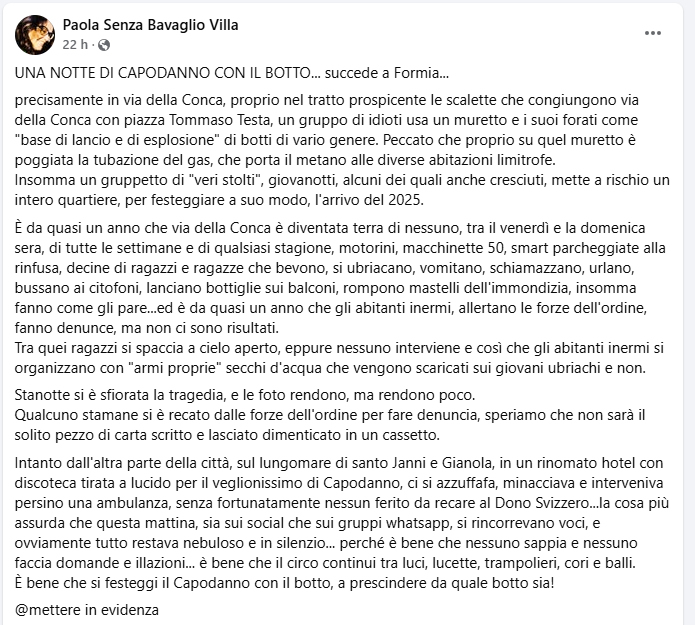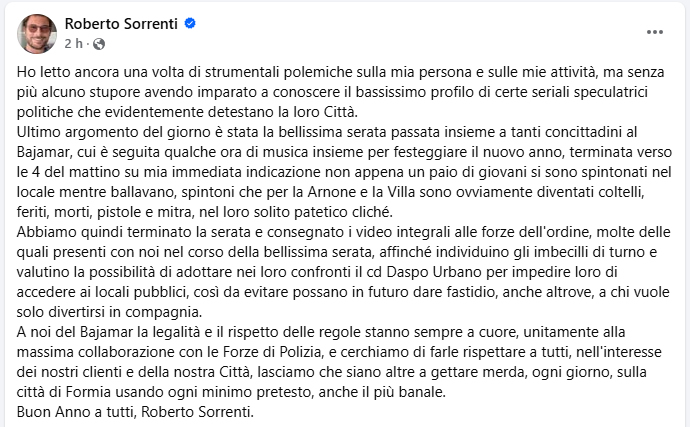A noi del Bajamar la legalità e il rispetto delle regole stanno sempre a cuore, unitamente alla massima collaborazione con le Forze di Polizia, e cerchiamo di farle rispettare a tutti, nell’interesse dei nostri clienti e della nostra Città, lasciamo che siano altre a gettare mxxxx, ogni giorno, sulla città di Formia usando ogni minimo pretesto, anche il più banale. Buon Anno a tutti, Roberto Sorrenti.”