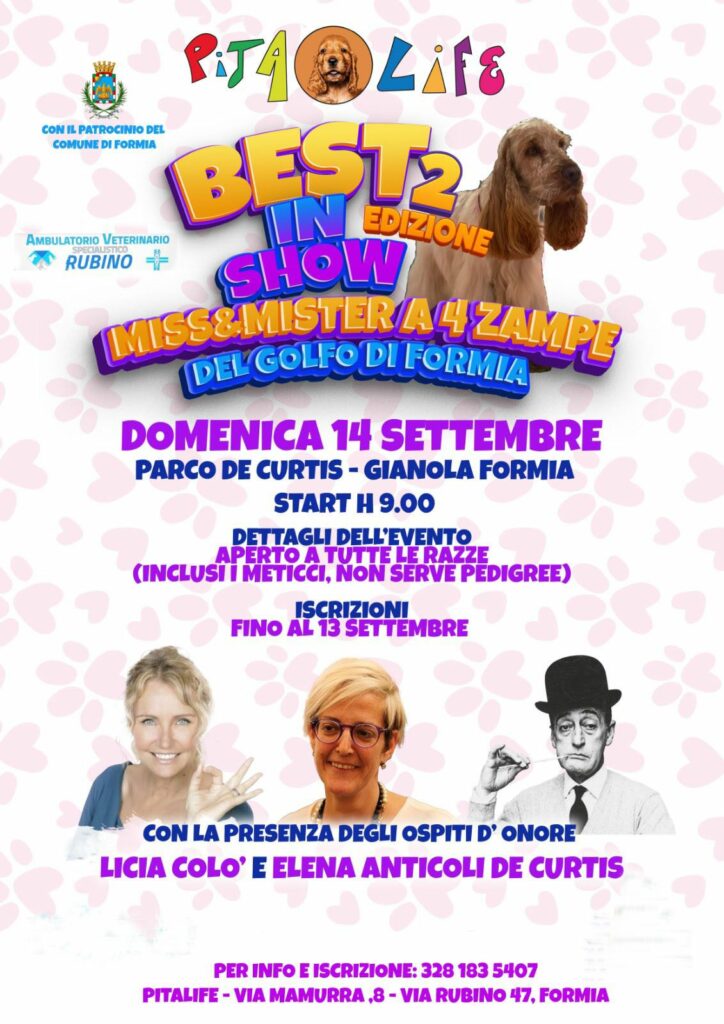 Le iscrizioni sono aperte fino al 13 settembre, contattando il 328 183 5407 o recandosi presso PitaLife, in via Mamurra 8 o via Rubino 47, a Formia. “Best in Show” non premierà solo la bellezza, ma l’emozione. La capacità di un cane di farci ridere, commuovere, vivere il presente. Sarà una giornata per le famiglie, per gli amanti degli animali, ma soprattutto per chi sa che il vero spettacolo… è quell’amore silenzioso che cammina al nostro fianco, ogni singolo giorno. Di seguito la locandina dell’evento: