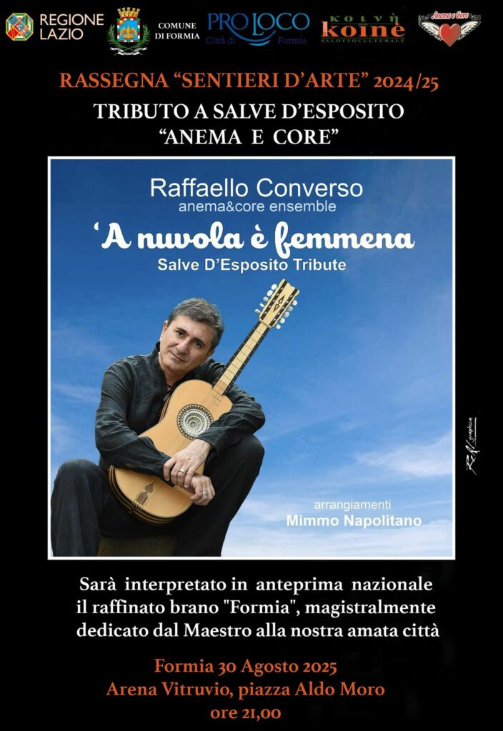Formia rende omaggio a Salve D’Esposito: in anteprima nazionale il brano “Formia” – Un evento di grande spessore culturale e musicale animerà l’Arena Vitruvio in Piazza Aldo Moro alle ore 21:00, nell’ambito della rassegna “Sentieri d’Arte”: va in scena “’A nuvola è femmena – Anema e Core, Salve D’Esposito Tribute”, un sentito omaggio a uno dei più raffinati compositori della tradizione napoletana del Novecento. Protagonista della serata sarà Raffaello Converso insieme all’Anema & Core Ensemble, che guideranno il pubblico in un percorso musicale e poetico tra le celebri melodie di Salvo D’Esposito, autore di capolavori immortali come Anema e Core.