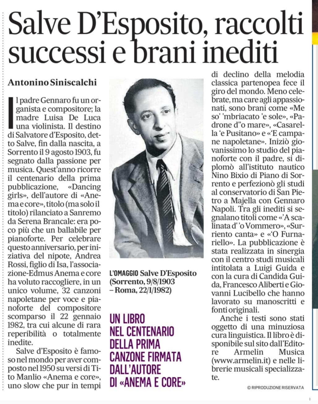 “Salvatore D’Esposito, meglio conosciuto come Salve D’Esposito (Sorrento, 9 agosto 1903 – Roma, 22 gennaio 1982), è stato un compositore e direttore d’orchestra italiano di grande rilievo, celebre soprattutto per il suo contributo alla tradizione della canzone napoletana. La sua fama è indissolubilmente legata al successo di “Anema e core”, uno dei brani più iconici del repertorio musicale partenopeo, che ha conquistato il pubblico italiano e internazionale.