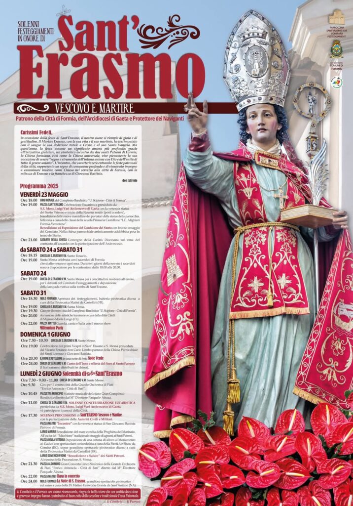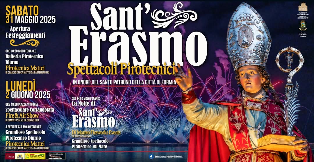 I due eventi di punta si inseriscono in un programma ricchissimo, che prende il via venerdì 23 maggio con il giro del Complesso Bandistico “U. Scipione” e la celebrazione eucaristica con l’arcivescovo di Gaeta Mons. Luigi Vari, e prosegue fino alla serata finale del 2 giugno, con fuochi d’artificio sul mare, spettacoli pirotecnici diurni, processioni solenni e concerti lirici. Tra i momenti più attesi, anche la grande processione del 2 giugno alle ore 17:30, con la benedizione del mare, l’incontro simbolico tra i due santi patroni Sant’Erasmo e San Giovanni Battista, e la spettacolare coriandolata in piazza della Vittoria.