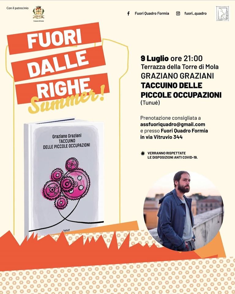 Appuntamento il 9 luglio alle ore 21:00 sulla bellissima terrazza della Torre di Mola con Graziano Graziani e il suo “Taccuino delle piccole occupazioni” edito da Tunué. IL LIBRO. Un romanzo sulle occasioni mancate. Girolamo, il protagonista, è uno stralunato osservatore del mondo, che confabula con sé stesso e non smette mai di ragionare su quello che vede attorno, sulla città in perenne mutamento, sulle esistenze multiformi che la abitano. In questa biografia cogitabonda, Girolamo come tutti vive molte vite, alla ricerca di un centro di gravità che continua a sfuggirgli. La sua unica stella polare è Viola, un amore vissuto e perduto più volte, che incarna ai suoi occhi la possibilità di una condizione diversa. Ma Viola è un approdo impossibile, un’isola fantasma che scompare all’orizzonte. E anche Girolamo, che è nato il 29 febbraio, un giorno che neanche esiste tutti gli anni, ha in fondo l’impressione di esistere soltanto a intermittenza. L’AUTORE. Graziano Graziani è una delle voci di Rai Radio 3, cura documentari per RAI 5, è caporedattore dei “Quaderni del Teatro di Roma”, si occupa di teatro contemporaneo. E’ consigliata la prenotazioni a assfuoriquadro@gmail.com o presso la sede dell’associazione in Via Vitruvio 344.