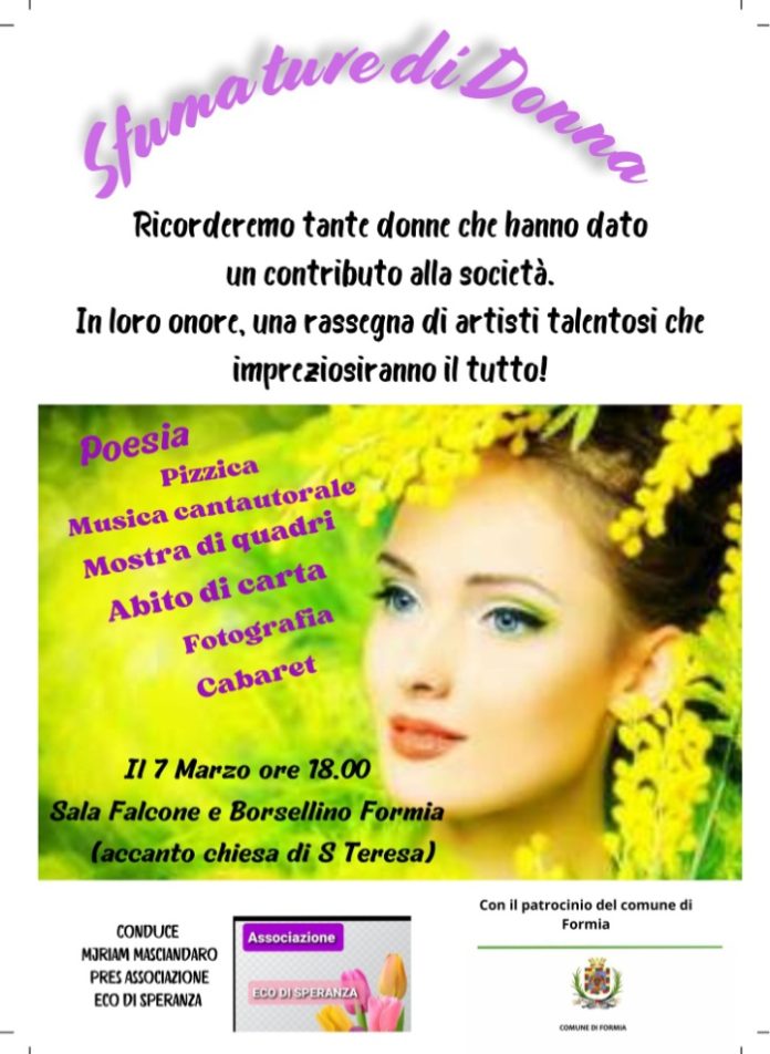 La presidente Counselor, Mediatrice familiare Mjriam Masciandaro ne parla con entusiasmo”Abbiamo voluto raggruppare tanti artisti e testimonianze al femminile, per un evento in cui si ricorderanno donne che si sono distinte in società. Credo sia doveroso ricordarle, noi proveniamo da quel passato che in qualche modo ci ha segnato profondamente, un passato difficile ma anche coraggioso”L’ evento “Sfumature di Donna” si terrà il 7 Marzo dalle ore 18.00 alle 19.30 presso la sala Falcone e Borsellino.Potrete ammirare l’ elevato talento dei partecipanti: dalla pittura al ricamo, dalla musica popolare e cantautorale fino alla fotografia e al cabaret.