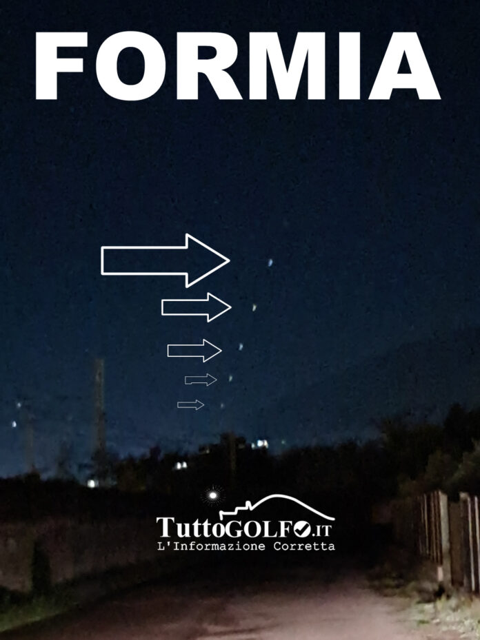 Formia – Strani punti luminosi nel cielo: la foto di un lettore incuriosisce la città – Intorno alle 19:00 di questa sera, diversi residenti hanno segnalato la presenza di strani punti luminosi nel cielo, disposti in modo perfettamente equidistante e privi di qualsiasi intermittenza. Una foto, inviata alla nostra redazione da un lettore, mostra una serie di luci bianche allineate, visibili per alcuni secondi prima di dissolversi all’orizzonte.