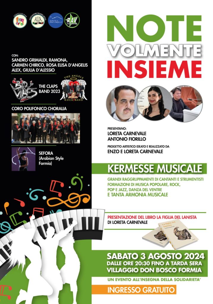 Formia, Villaggio Don Bosco: “NOTEvolmente insieme”, Kermesse musicale. La data – Sabato 3 agosto dalle ore 20:30 e fino a tarda serata, presso il Villaggio Don Bosco di Formia, sarà presentata la kermesse musicale “NOTEvolmente insieme” con grandi raggruppamenti di cantanti e strumentisti, formazioni di musica popolare, rock e jazz, danza del ventre e tanta armonia musicale. Presentano Loreta Carnevale e Antonio Fiorillo. Progetto artistico ideato e realizzato da Enzo e Loreta Carnevale. Di seguito la locandina dell’evento: