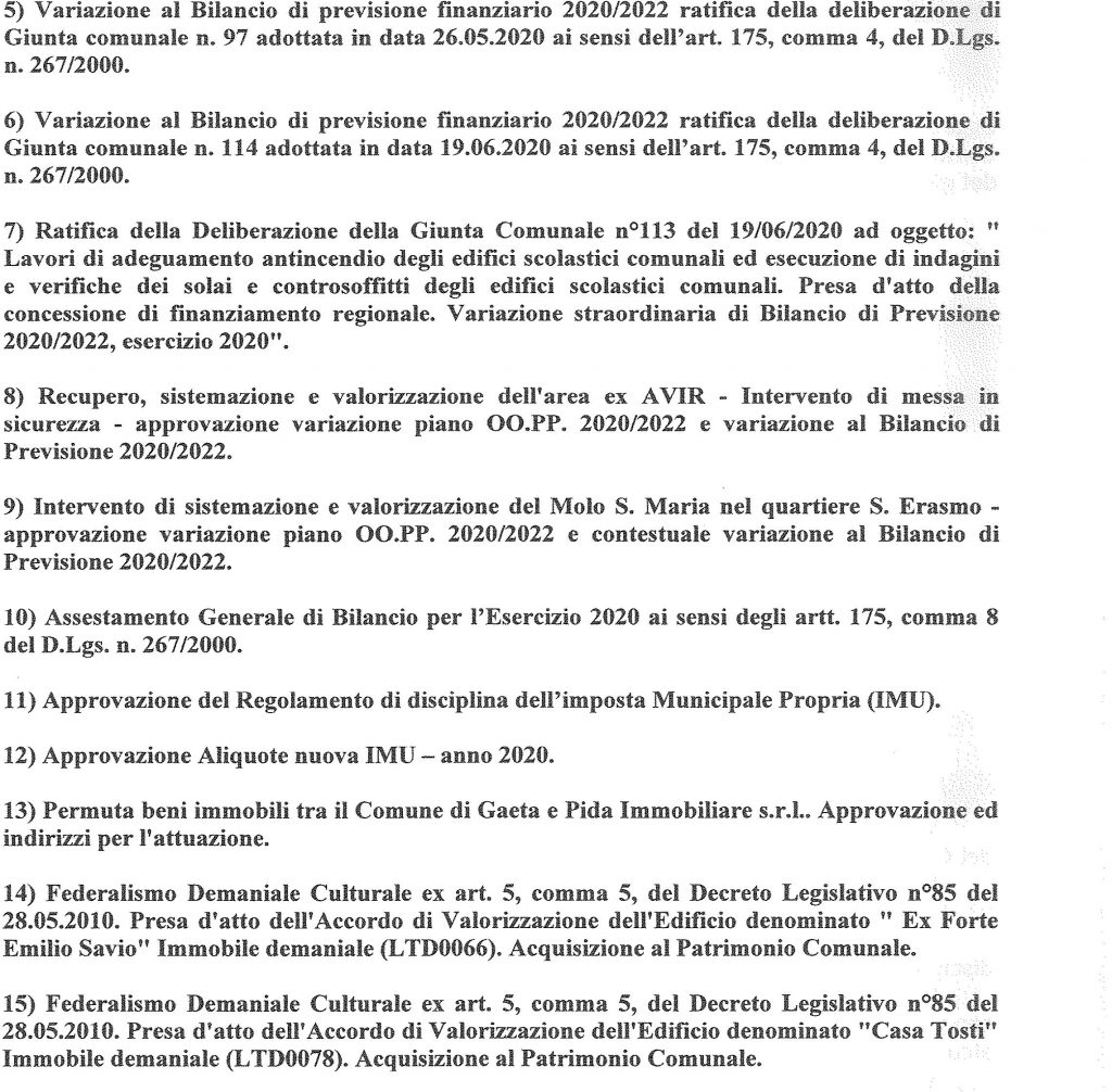 Giuseppina Rosato, presidente del Consiglio Comunale di Gaeta, convoca l’assise civica al quale partecipano il Sindaco Cosmo Mitrano, i Consiglieri Comunali: Caso Maurizio, Conte Gianna, Coscione Luigi, De Angelis Franco Dies Gennaro, Di Vasta Marco, Gaetani Luigi, Leccese Cristian, Magliozzi Massimo, Marzullo Luigi, Matarazzo Raffaele, Pellegrino Katia, Romanelli Gennaro, Salipante Pietro, Scinicariello Emiliano. Il Consiglio Comunale di Gaeta è convocato – presso t’Aula consiliare dell’edificio comunale sito in Piazza XIX Maggio, in seduta pubblica ordinaria, per lunedì 27 luglio alle ore 9.00, fino all’esaurimento dell’argomento all’ordine del giorno con prosecuzione, all’occorrenza, anche per i giorni successivi a quello iniziate di convocazione con inizio alle ore 8:00 (anche oltre le ore 24:00 di ogni giorno di riunione), salvo diversa determinazione del Consiglio, per la trattazione del seguente ordine del giorno: 1. Interrogazioni, 2. Interpellanze, 3. Approvazione del rendiconto detta gestione per l’esercizio 2019 ai sensi dell’art.227 Decreto Legislativo n°267/2000. 4.Relazione sullo stato di attuazione dette linee programmatiche ai sensi dell’art.21 – comma 4 – detto Statuto Comunale e ai sensi dell’art.50 – comma 7 – del Regolamento del Consiglio. Quindi con integrazione sono stati aggiunti altri punti in discussione elencati da numero 5 al numero 15.
