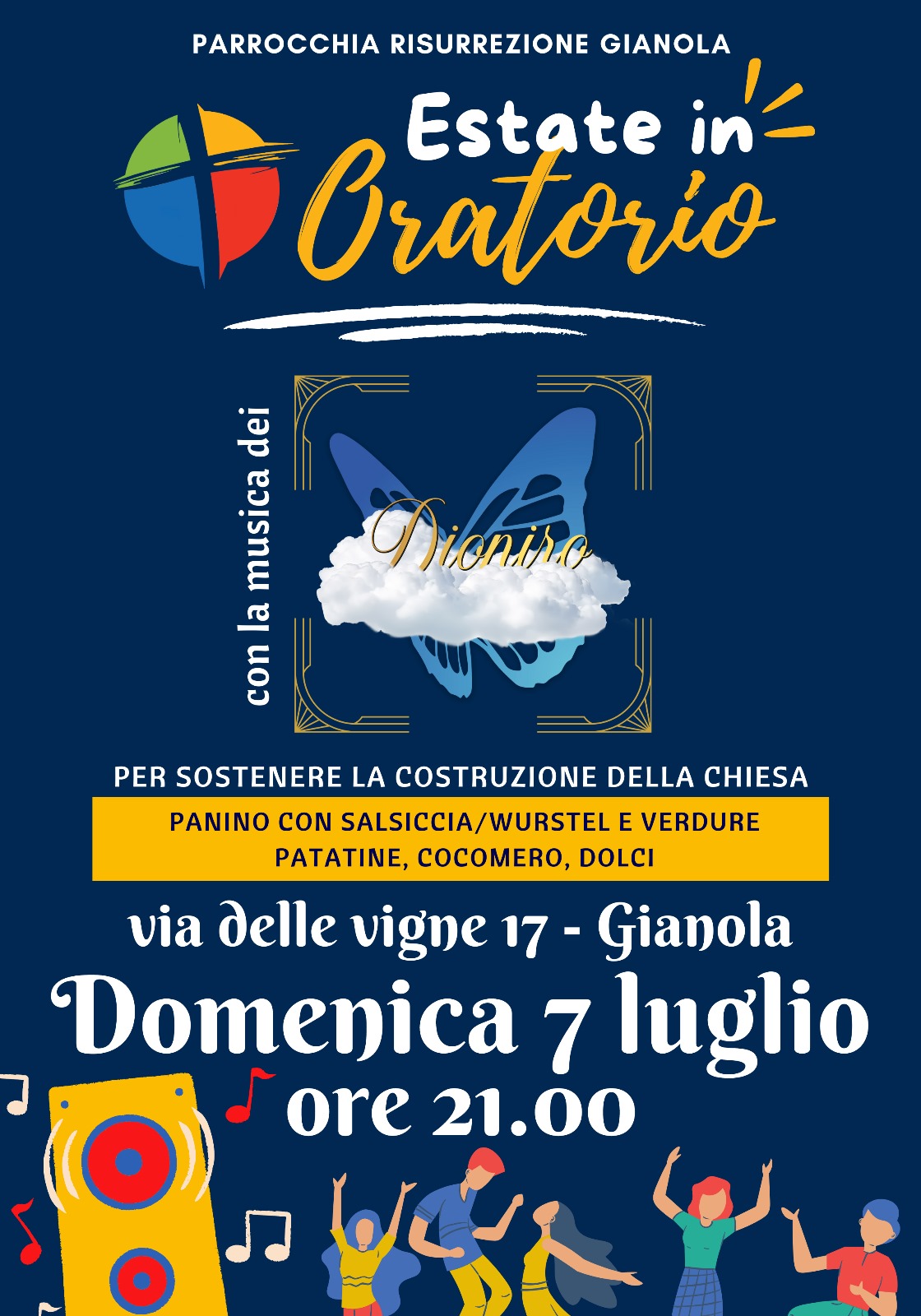 Gianola – 7 luglio, ore 21:00 Panino con salsiccia / wurstel e verdure, patatine, cocomero e dolci – Domenica 7 luglio, ore 21:00, in via delle Vigne, 17 a Gianola di Formia ” Panino con salsiccia / wurstel e verdure, patatine, cocomero e dolci”. L’evento è finalizzato a sostenere la costruzione della Chiesa della Parrocchia Risurrezione di Gianola. Di seguito la locandina dell’evento: