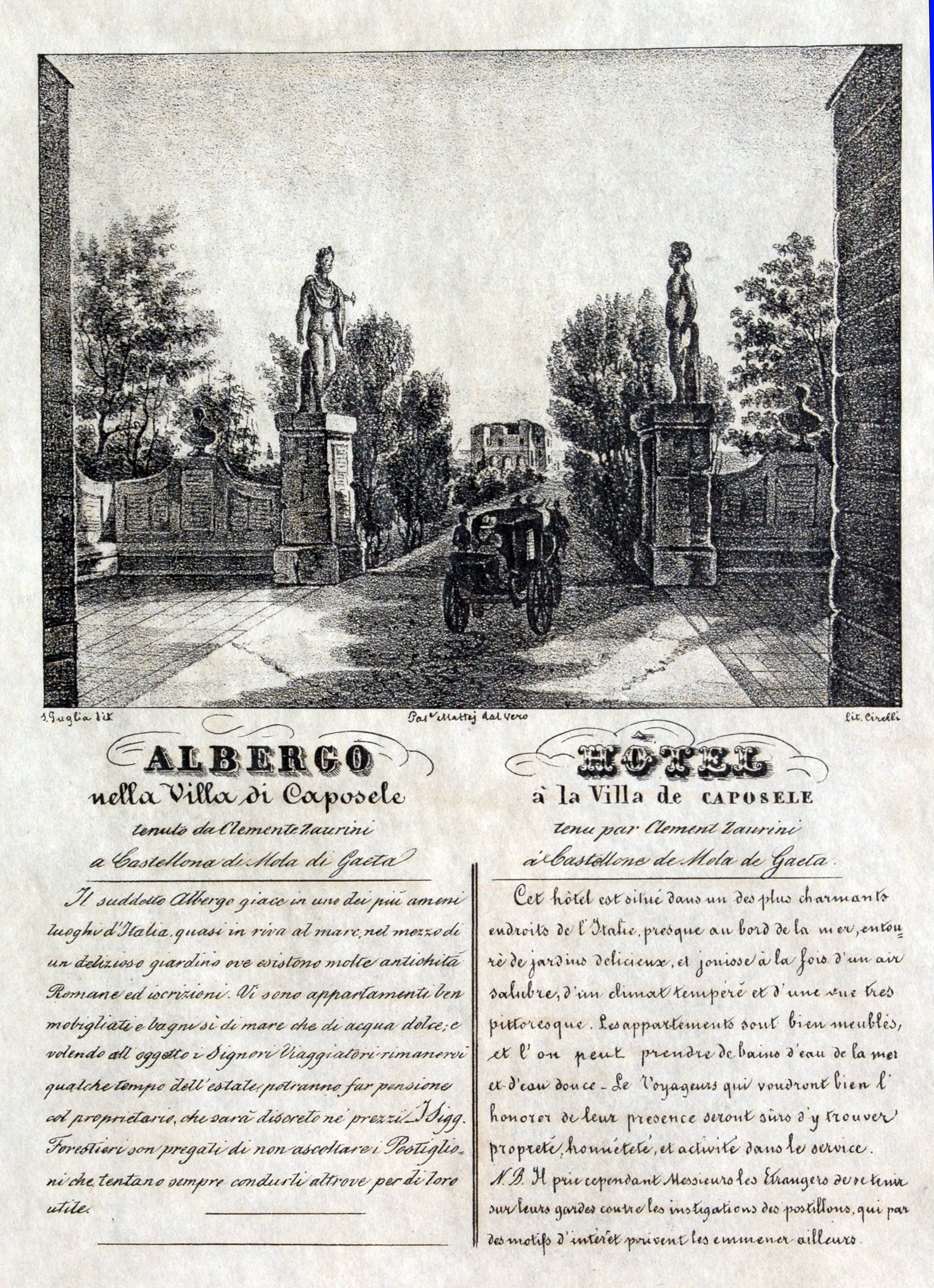 «Sabato 25 ottobre. A Mola di Gaeta alloggiai all’Albergo del Cicerone, posto in una posizione deliziosa. Pochi passi più innanzi vi è un altro albergo detto dell’Angiolo ed è la villa stessa del principe di Caposele locata per albergo. Questi due alberghi fanno tentazione di rimanervi una settimana, tanto più se ai begli avanzi di antichità si aggiunga il buon Falerno che si beve in questi alberghi. Ambedue hanno un giardino delizioso pieno di aranci esposti al cielo senza bisogno di riparo per l’inverno. Clima beato, località deliziose, posizione invidiabile se avesse le cose che le mancano! All’albergo fui trattato di una cena squisita con buon Falerno, che conservasi in barili ma che mettesi in bottiglie tosto che vi si mette mano.