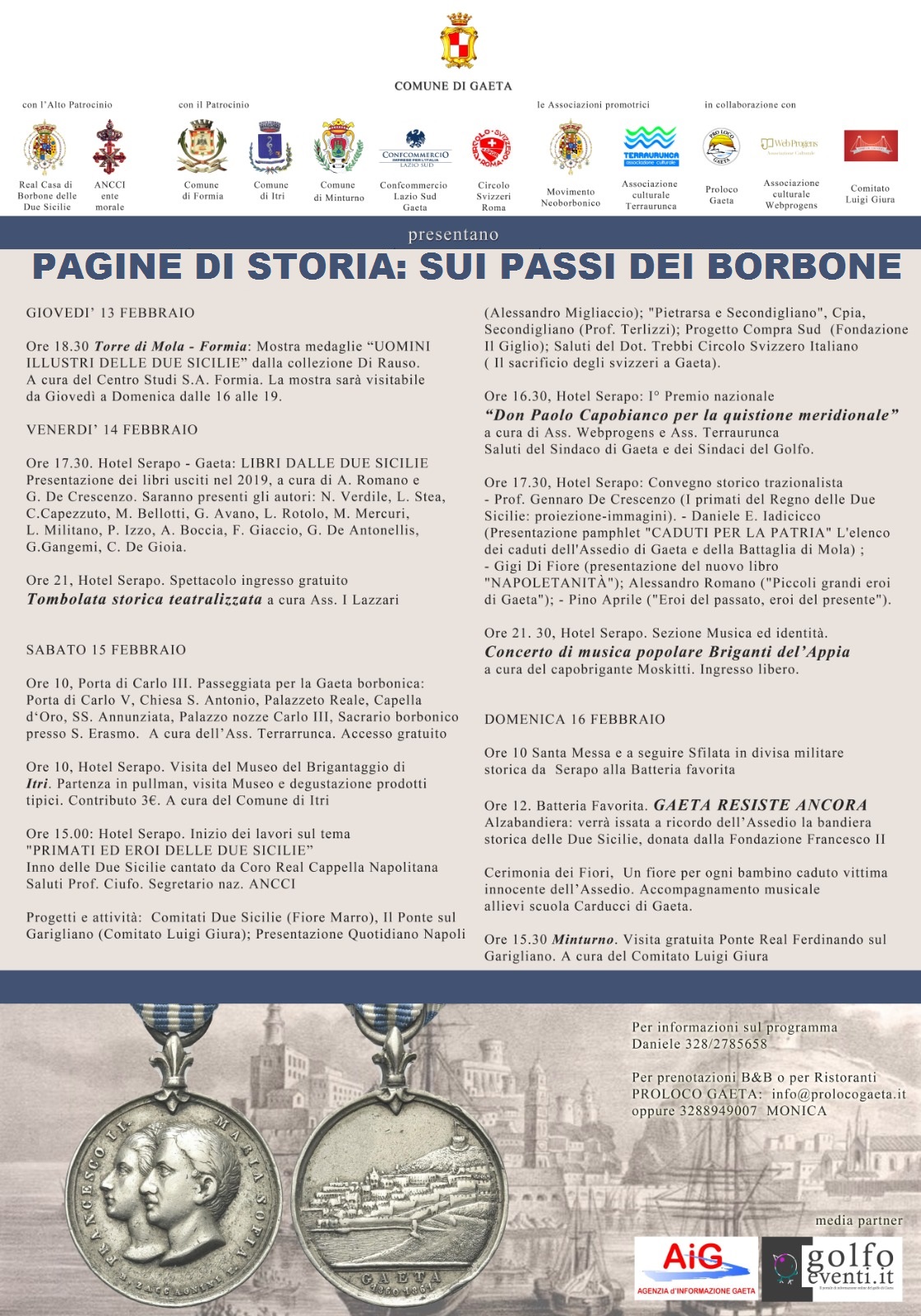 Il brand ideato dalla delegata alla Cultura del Comune di Gaeta Maria Pia Alois e che in inserisce in un progetto culturale più ampio che tocca la promozione turistica della città e la politica di marketing territoriale fortemente voluta dall’Amministrazione Mitrano. Una rassegna storico-culturale promossa dal Comune di Gaeta, con l’Alto Patrocinio della “Real Casa di Borbone delle Due Sicilie”, ANCCI – Associazione Nazionale Cavalieri Costantiniani Italiani, con il Patrocinio dei Comuni di Formia, Itri, Minturno, Confcommercio Lazio-Sud Gaeta, Circolo Svizzeri Roma; un evento promosso dal Movimento Neoborbonico, Associazione “Terraurunca”, in collaborazione con Pro Loco Gaeta, Associazione Culturale Webprogens, Comitato  “Luigi Giura” ed il “Museo del Fronte e della Memoria”.