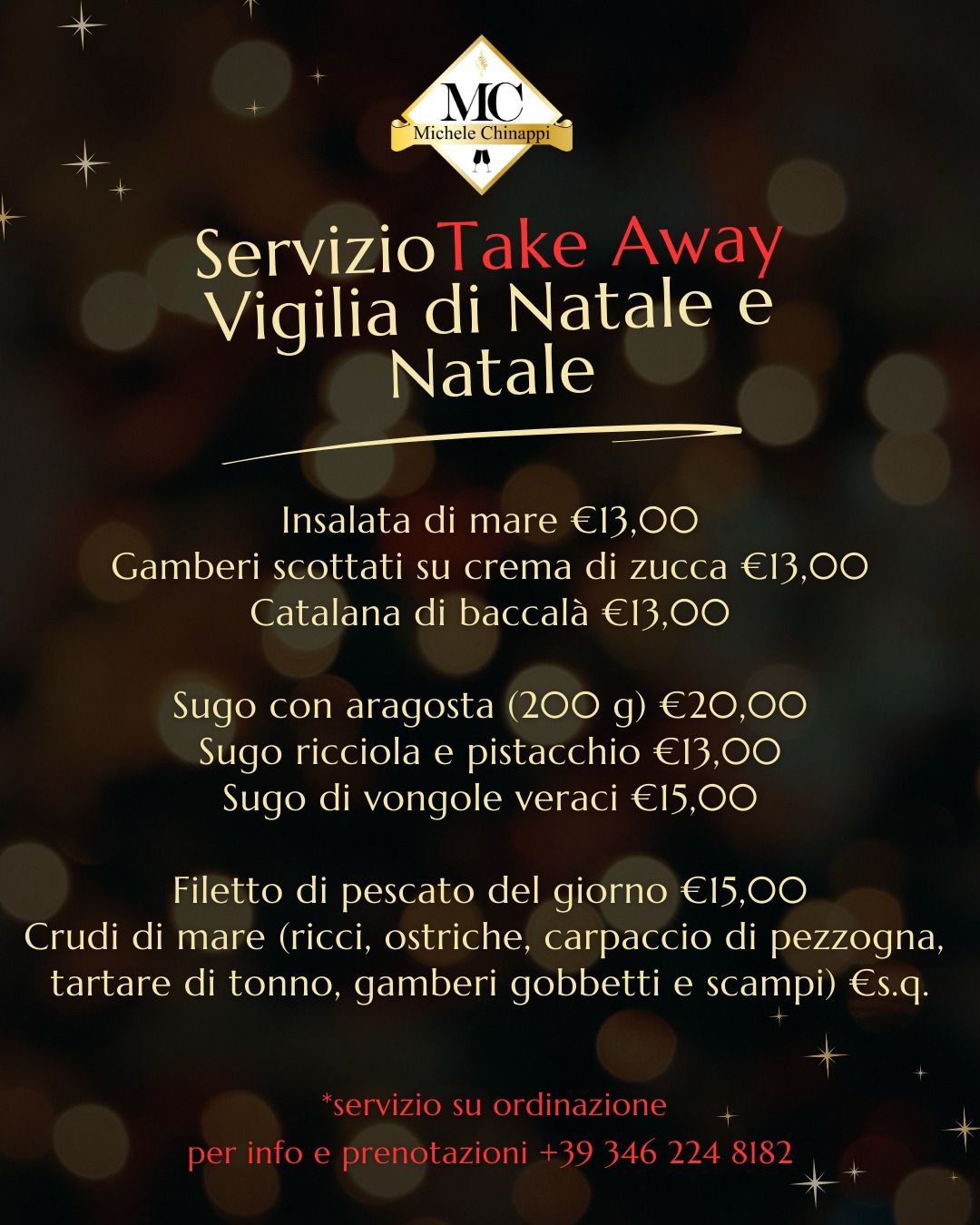 Per gli amanti del crudo, infine, è disponibile una ricca selezione di crudi di mare, che comprende ricci, ostriche, carpaccio di pezzogna, tartare di tonno, gamberi gobbetti e scampi, disponibili su richiesta in base alla disponibilità del mercato. Il servizio è attivo esclusivamente su ordinazione. Per informazioni e prenotazioni è possibile contattare il numero +39 346 224 8182. Un’occasione perfetta per vivere le festività natalizie all’insegna del gusto, portando a casa l’eleganza e la qualità della cucina di mare firmata Michele Chinappi. Di seguito la locandina: