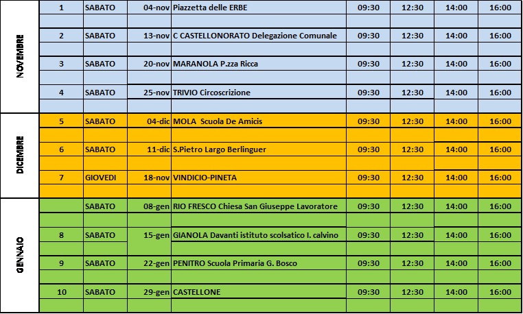 Per il prossimo trimestre le consegne avverranno di sabato secondo il seguente calendario: