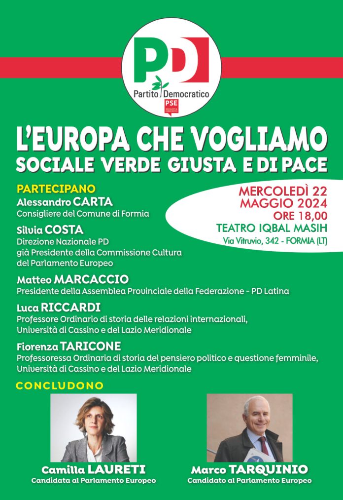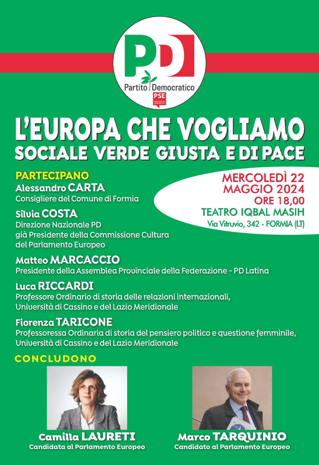 Mercoledì 22 maggio 2024, alle ore 18:00 – presso il Teatro IQBAL MASIH a Formia (Via Vitruvio n. 342) – si terrà l’incontro “L’EUROPA CHE VOGLIAMO, SOCIALE VERDE GIUSTA E DI PACE”, con i candidati del Partito Democratico al Parlamento Europeo, Camilla Laureti e Marco Tarquinio.