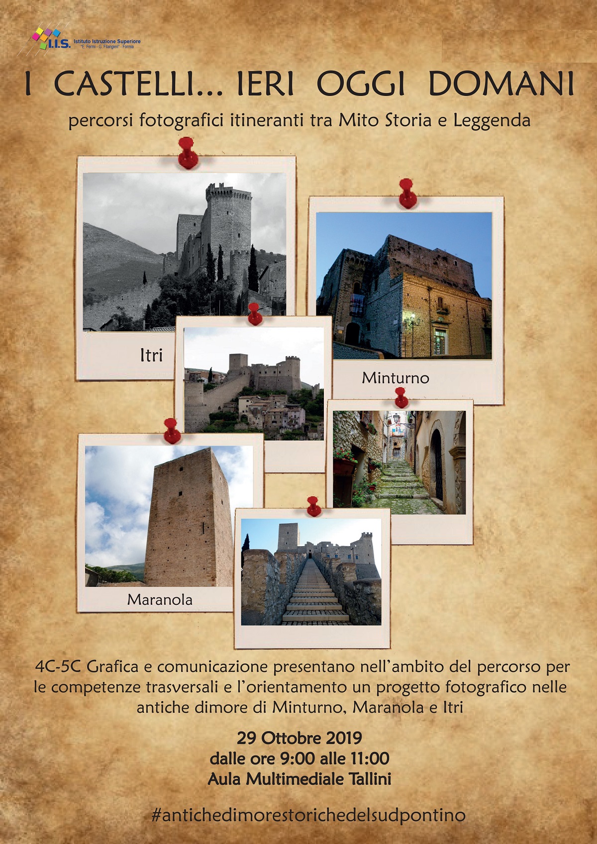 Martedì 29 ottobre dalle 9.00 alle 11.00 presso l’aula multimediale dell’istituto Tallini di Formia (Via della Cava Aurelia, Penitro) si terrà la presentazione del progetto fotografico “I castelli. Ieri, oggi e domani”, realizzato nell’ambito del percorso per le competenze trasversali e per l’orientamento dalle classi 4C e 5C Grafica e comunicazione dell’I.I.S. “Fermi – Filangieri” sede Tallini di Formia.