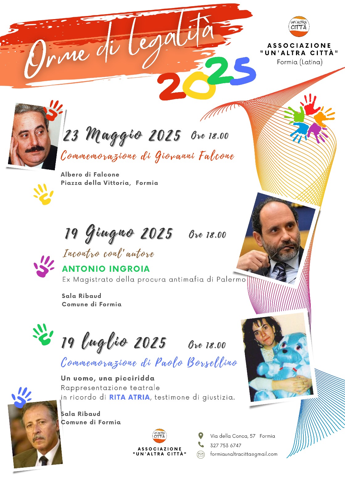 Altro significativo appuntamento sarà con l’ex magistrato antimafia Antonio Ingroia; l’incontro si terrà il 19 giugno alle ore 18 nella sala Ribaud del comune di Formia. Sempre nella sala Ribaud, il 19 luglio alle ore 18, saranno ricordati il giudice Paolo Borsellino e i componenti della sua scorta, con la rappresentazione teatrale in ricordo di Rita Atria, testimone di giustizia. La lotta alla criminalità, la difesa della legalità rappresentano oggi, ancor più di prima, impegno civile e responsabilità civica. Il nostro ringraziamento a quanti hanno, con i sacrifici o della propria vita, garantito libertà per tutti.” Lo comunica Un’Altra Città