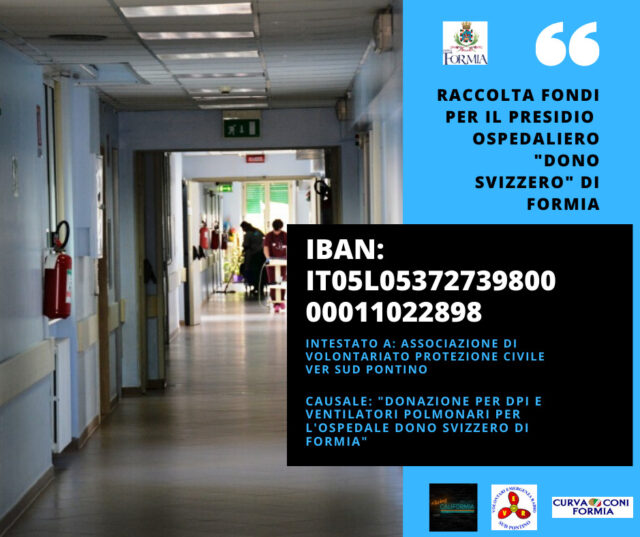 Un appello rivolto al cuore di noi tutti: grazie all’idea nata dai ragazzi di Living Califormia, sposata dal Comune di Formia, dal Ver Sud Pontino Formia Protezione Civile e dalla Curva Coni Formia, da lunedì 16 marzo è partita la raccolta fondi per l’Ospedale Dono Svizzero. Chiunque può donare anche soltanto un euro. Un’importante opportunità in questa fase davvero delicata, dal punto di vista sociale e sanitario. Tutti noi possiamo fare qualcosa di concreto. Per questo motivo un pool di sigle ha pensato di aiutare realmente l’Ospedale Dono Svizzero di Formia. Anche una piccola donazione può fare la differenza, i fondi raccolti saranno direttamente devoluti all’ospedale per il rafforzamento della terapia intensiva e DPI. È possibile donare utilizzando l’IBAN: IT05 L053 7273 9800 0001 1022 898 oppure tramite la piattaforma gofundme all’indirizzo: https://www.gofundme.com/f/aiutiamo-il-dono-svizzero-di Formia intestato a: Associazione di Volontariato delle Protezione Civile VER Sud Pontino; con la causale: Donazione per DPI e ventilatori polmonari per l’Ospedale Dono Svizzero di Formia.