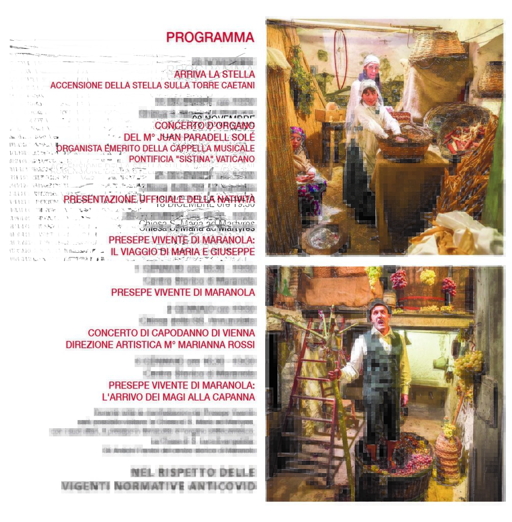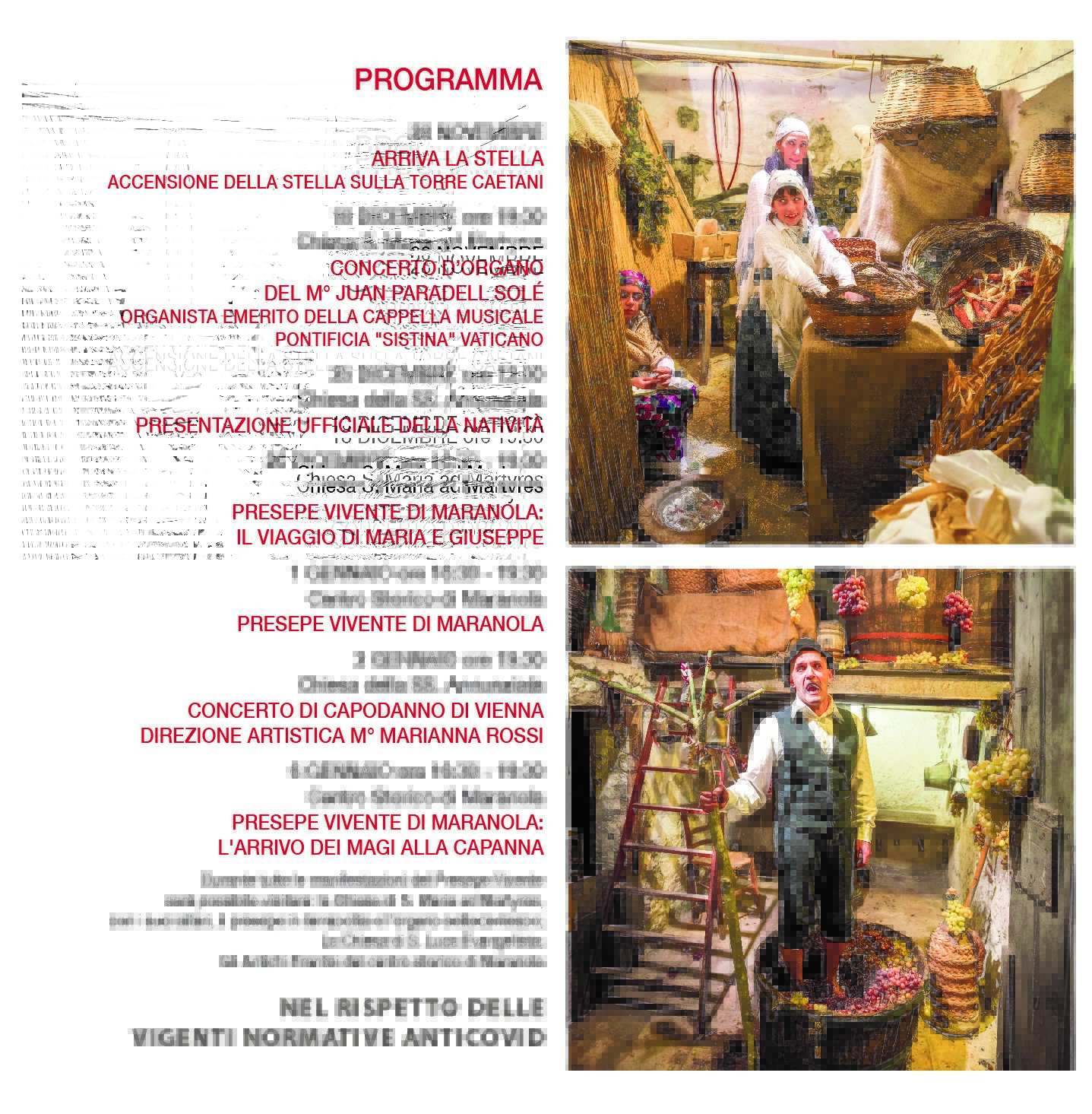 Il 25 Dicembre invece come da tradizione si entrerà nel vivo della 47esima edizione del Presepe Vivente di Maranola con la presentazione della Natività. Il Presepe aprirà per ufficialmente le porte il 26 dicembre per proseguire poi nei giorni del 1 e 6 gennaio 2022. Circa 400 personaggi, in costume locale, rappresentano i mestieri di un tempo tra i vicoli, le cantine e gli ambienti di Maranola medievale. Essi fanno corona ad una vera Sacra Famiglia, anch’essa in costume locale, creando un’atmosfera antica e straordinaria fatta di colori e profumi, sulle note delle zampogne e delle antiche nenie.
