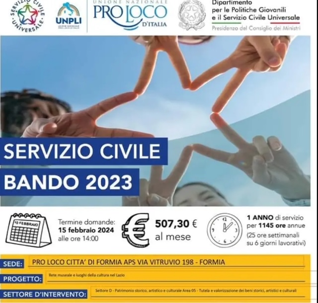 Pro Loco Città di Formia – Il presidente della Pro Loco Formia, Mario Persico, unitamente al Consiglio direttivo, comunica alla cittadinanza che è attiva e accessibile a ragazzi volontari fra i 18 e i 28 anni, la piattaforma on line per il Servizio Civile Universale. Sono richieste 4 unità. Un’ esperienza che sarà di aiuto nella vita. € 507,30 al mese. Gli aspiranti operatori volontari dovranno presentare la domanda di partecipazione attraverso la piattaforma DOL (domanda on line), tramite personal computer, tablet, smartphone all’indirizzo, http://domandaonline.serviziocivile.it La domande dovranno essere presentate entro le 14:00 del 15 febbraio p.v. Il progetto cui aderire è: Rete museale e luoghi della cultura nel Lazio. Settore: D – Patrimonio storico, artistico e culturale Area 05 – Tutela e valorizzazione dei beni storici, artistici e culturali.